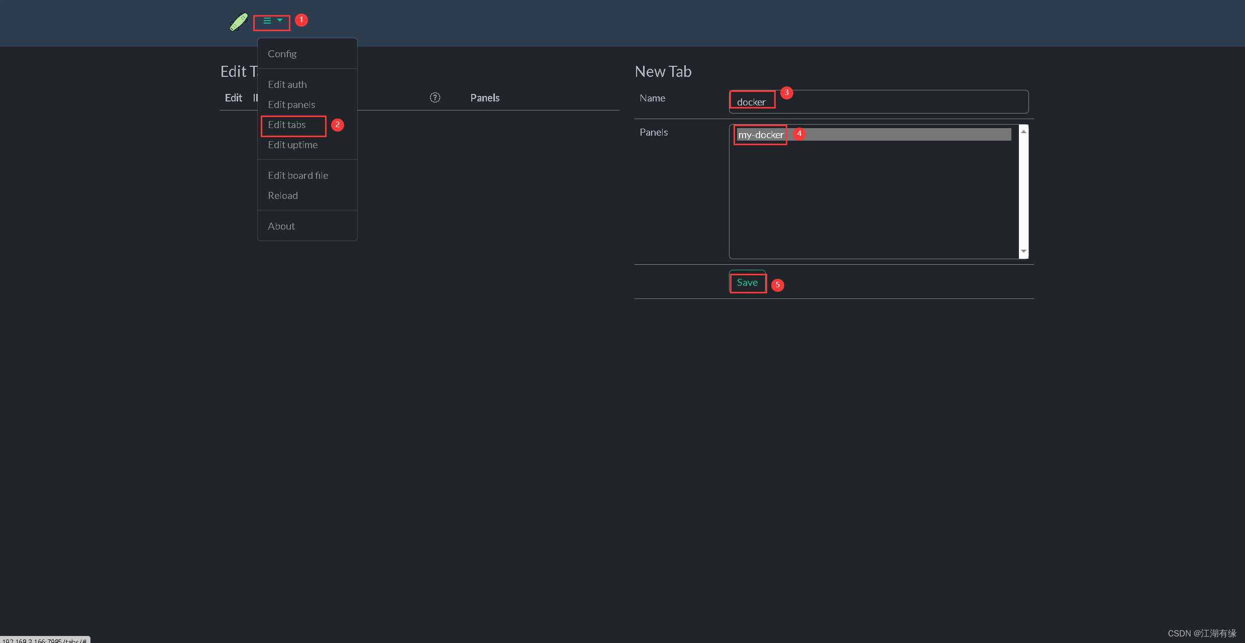 在tab管理页面,编辑tab名称,选择刚创建的面板,点击保存即可。