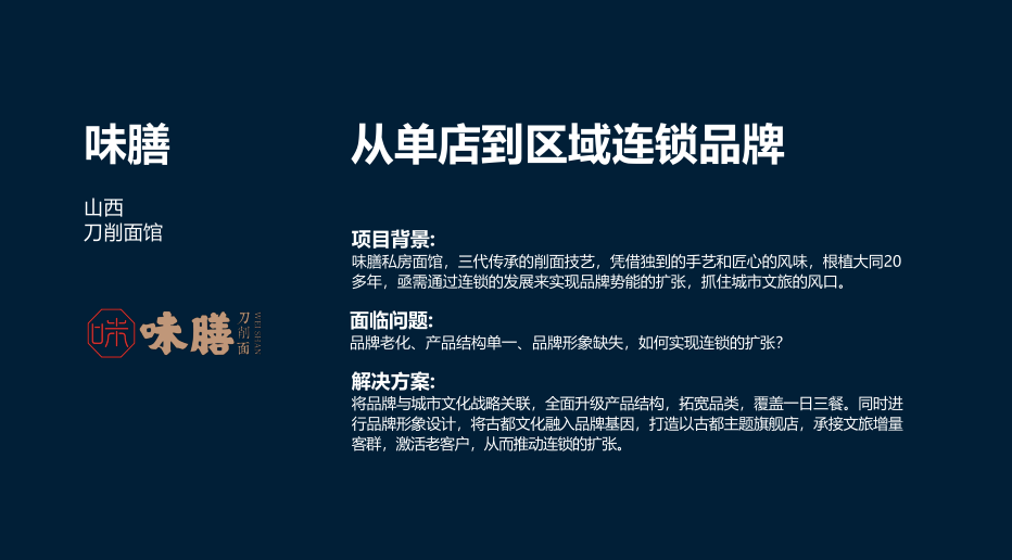 在餐饮行业竞争白热化的今天,一个三代传承的山西刀削面馆,如何从大同的单店突围,借力城市文旅风口,成功蜕变为区域连锁品牌?这背后,是以品牌全案策划 思维,将地域美食与城市文化战略关联,实现业绩暴涨 的经典案例。对于众多拥有优质产品却困于品牌力不足 、业绩增长乏力 的成长型企业而言,"味膳"的升级路径提供了一个可复制的样板。