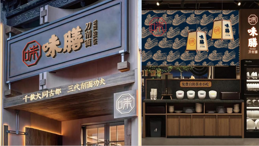 - 超级符号打造 :将"味膳"二字与传统印章形式结合,形成具有高辨识度和文化信任感的品牌符号。门店空间设计融入古建筑构件意象,让顾客从踏入店门开始,就沉浸于浓厚的文化氛围之中,彻底摆脱了"形象落后,视觉混乱低档"的旧貌。