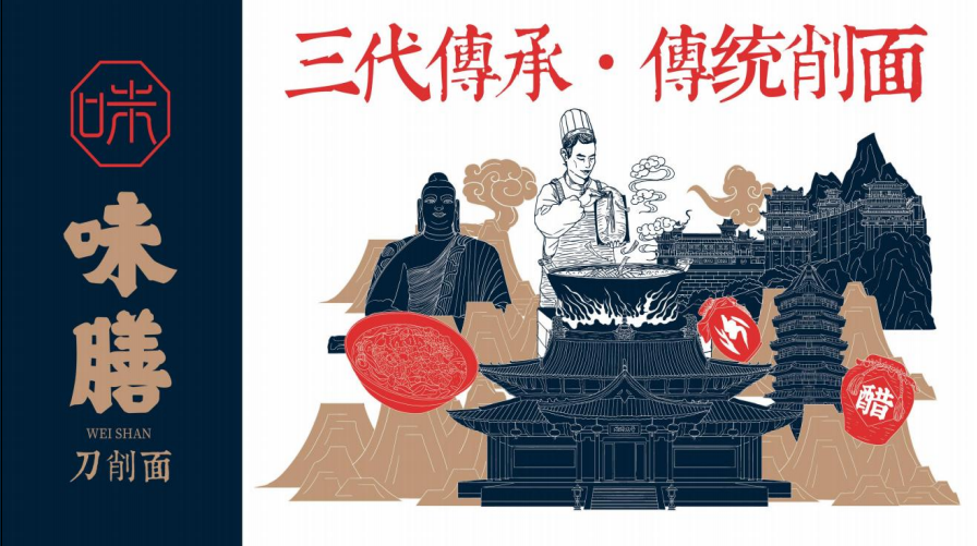 - 文化基因注入 :设计灵感深度挖掘大同的文化元素。主色调提取自古建筑中的佛金、朱红、藏青,彰显古都的厚重与华美。辅助图形巧妙融合"九龙壁海浪"的磅礴与"刀削面"的灵动线条,创造出独一无二的品牌纹样。