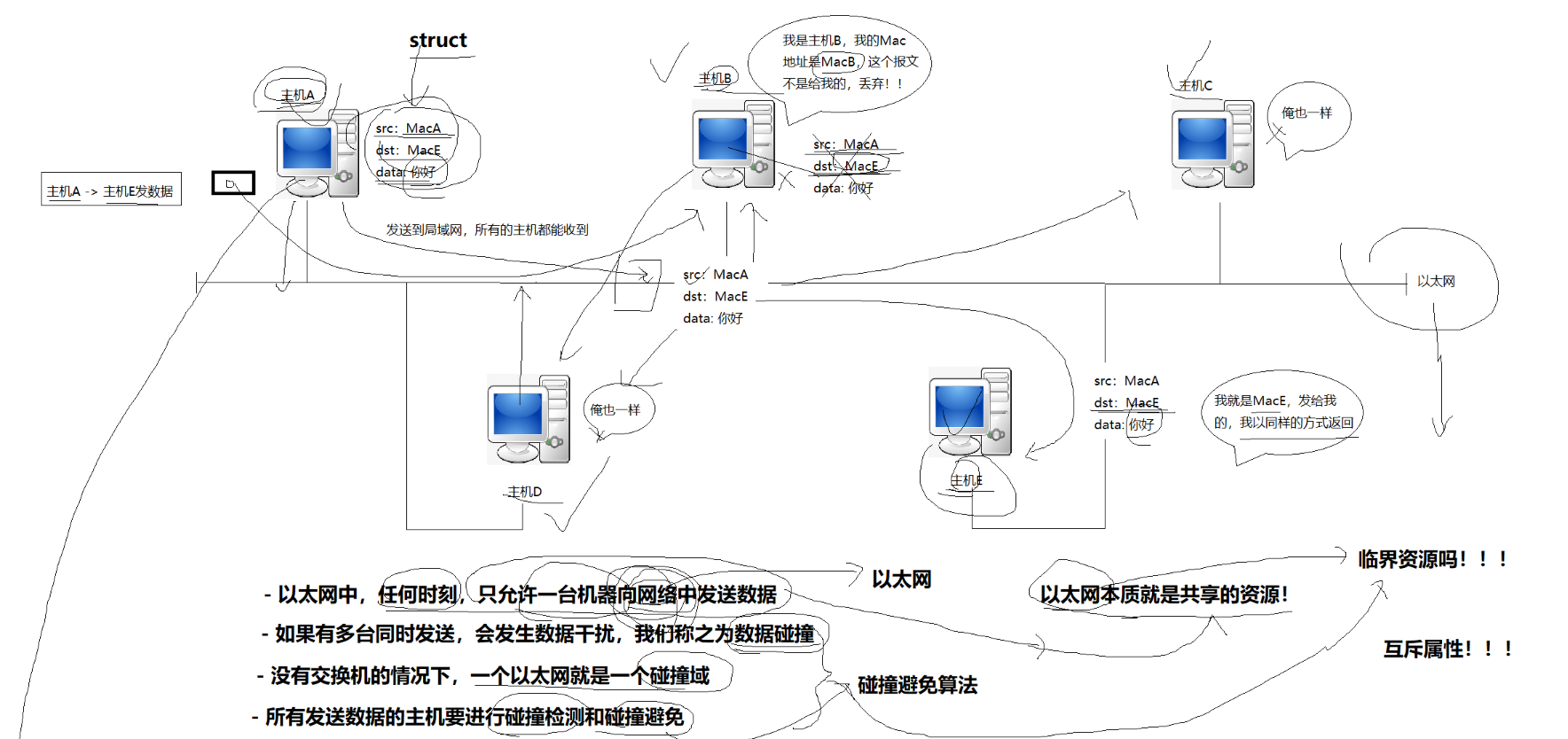 2、以太网就是临界资源,同一时刻只有一个主机能在上面发送数据。