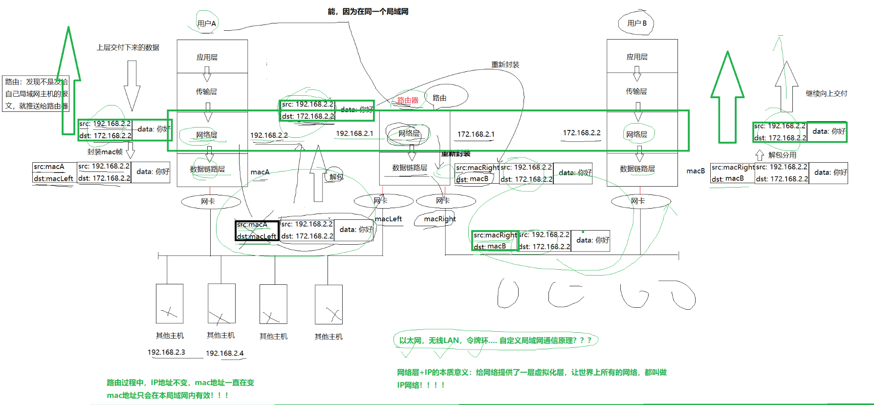 结论:路由过程中,IP地址不变,MAC地址一直在变。MAC地址只会在本局域网内有效!!