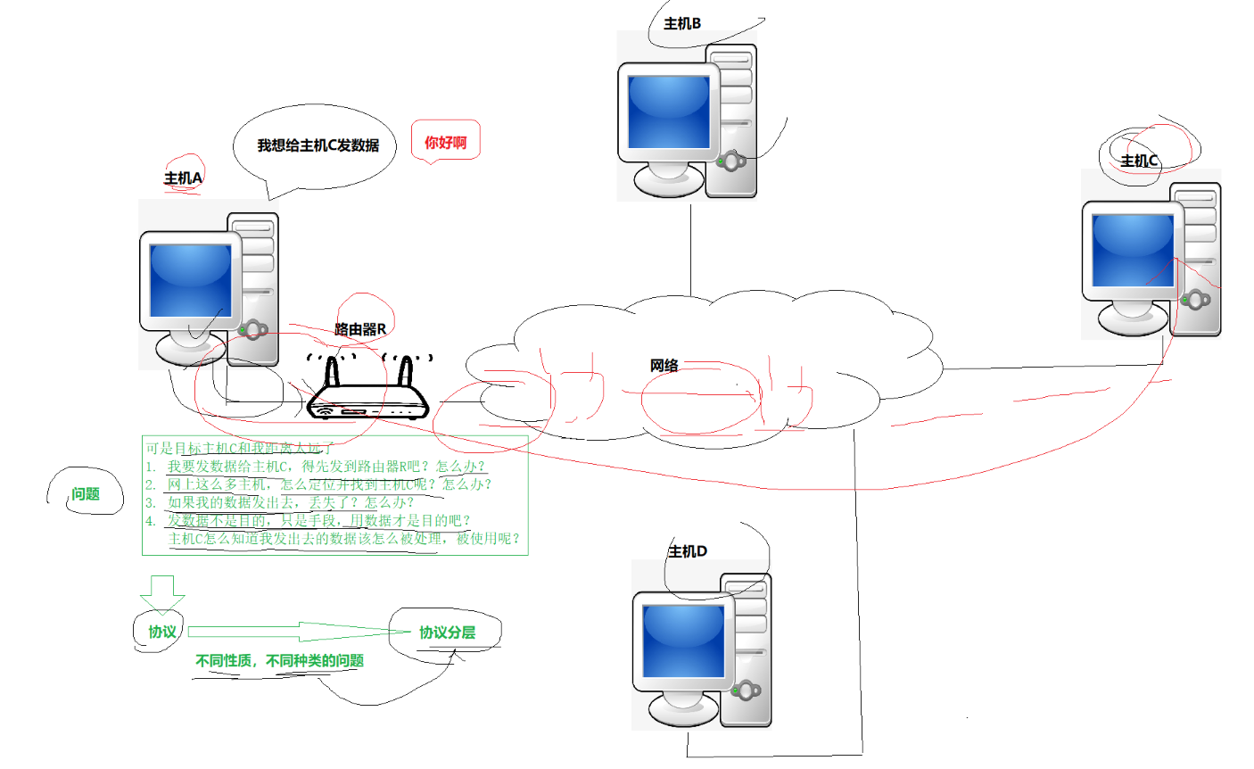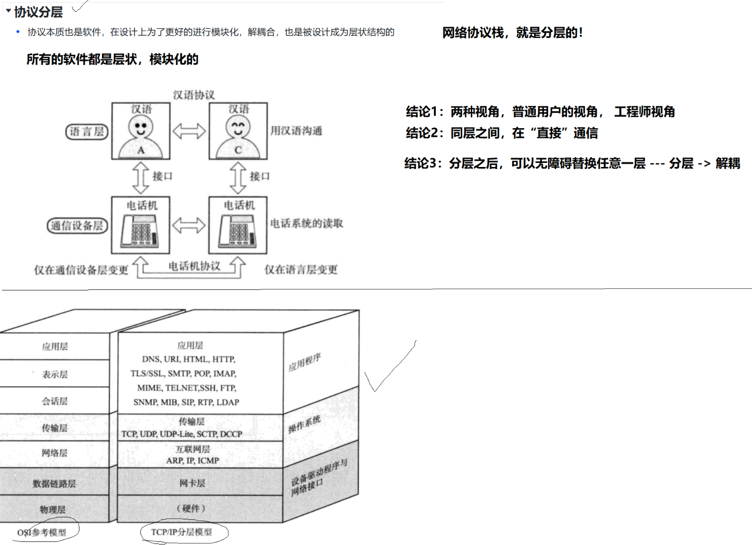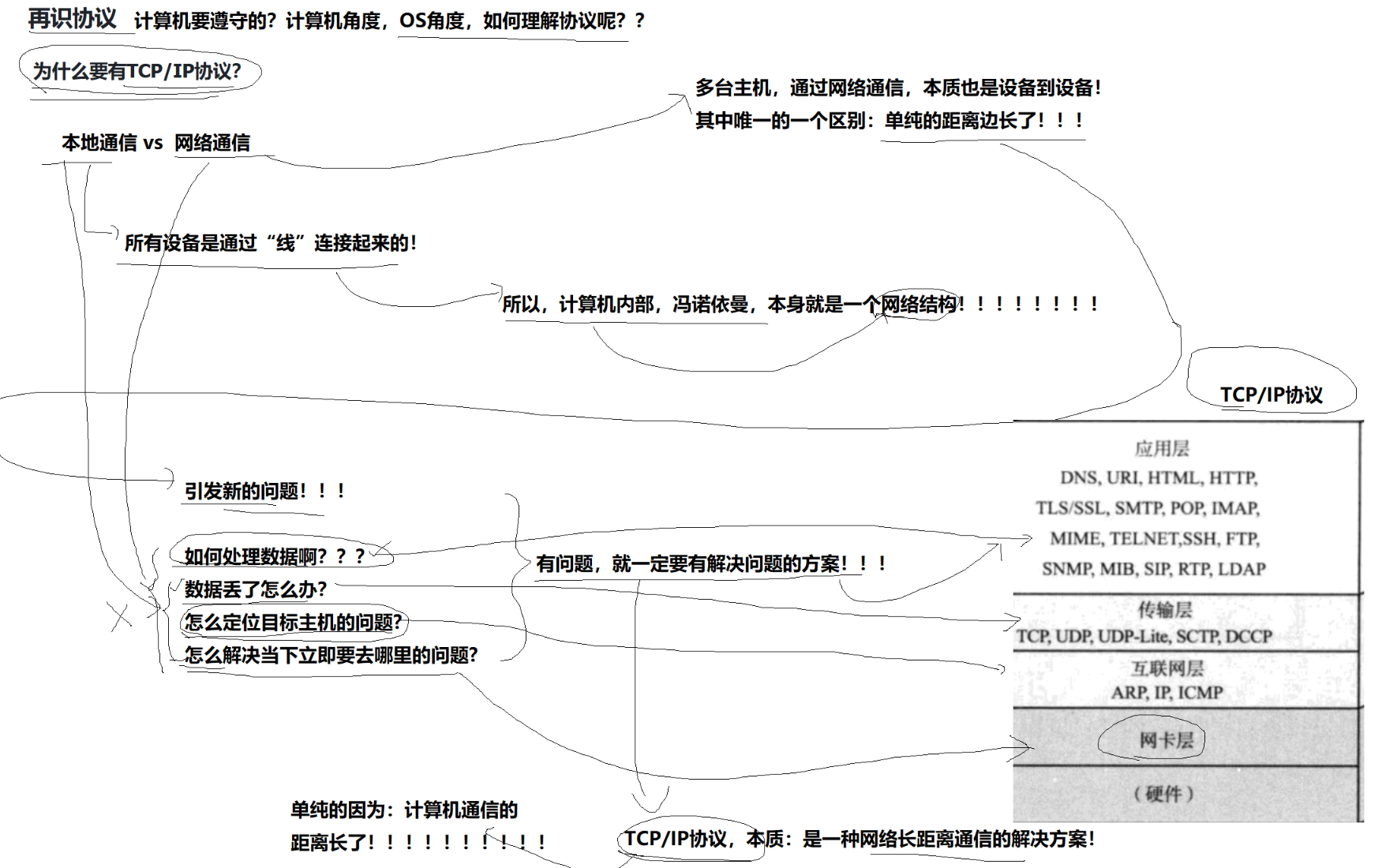 个人再次理解协议:相当于世界上有白种人、黄种人和黑种人,人不同,但是要交流,说的语音必须相同,相当于规定英语为全国通用语,所以用英语这套标准,使得所有人都能够交流。那么网络也是,各种主机设备都不同,有的是电脑,有的是手机,有的是苹果,有的是华为,都不同,但怎么通信呢,各自都要学会统一的语音,也就是TCP/IP协议,然后各自利用这个协议就能沟通通信了。