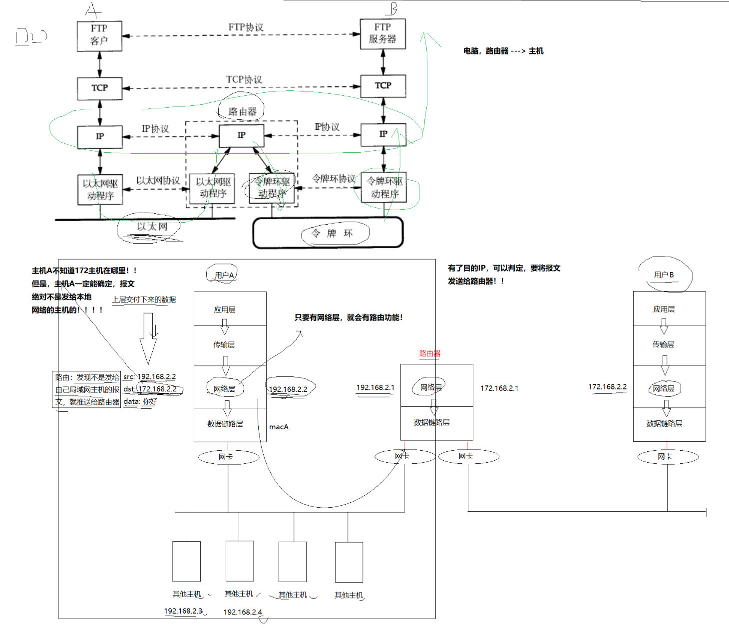 2、有目的IP,当前A主机就知道不是把数据发送给当前在同一个子网的其他主机,那只能向外发送,所以一定会发送给与A主机在同一局域网的路由器