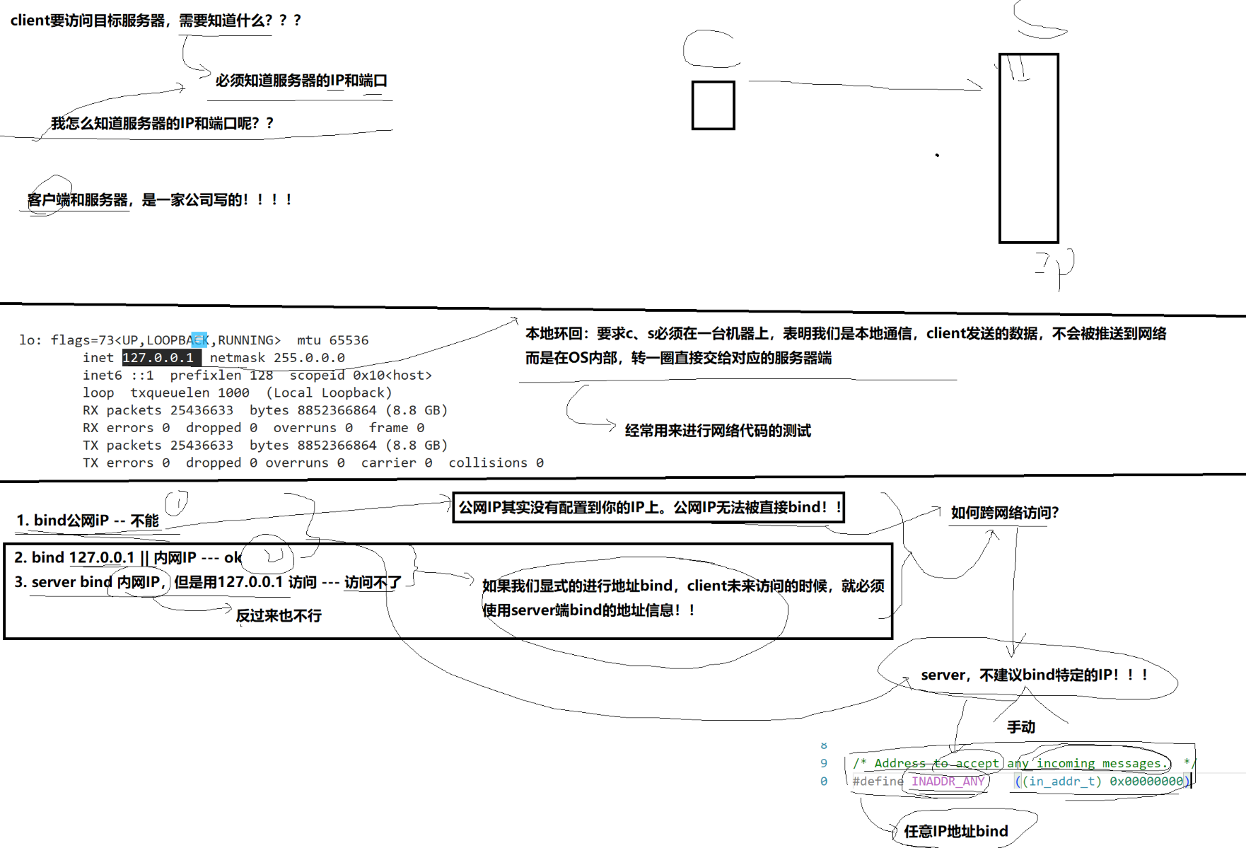 服务器端不能绑定公网Ip,因为一个服务器可能有多个ip地址,客户端通过多个ip地址都要访问服务器上的某个端口号(多个ip指向同一个端口号),我们希望服务器能收到每个IP地址对应的客户端请求,而不是只能收到其中某一个ip地址,所以我们不应该因为ip地址导致某个请求不能被响应。