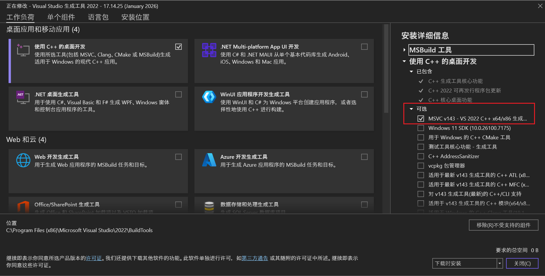 - 在右侧详细信息中,确认已选中 MSVC v143 - VS 2022 C++ x64/x86 生成工具。