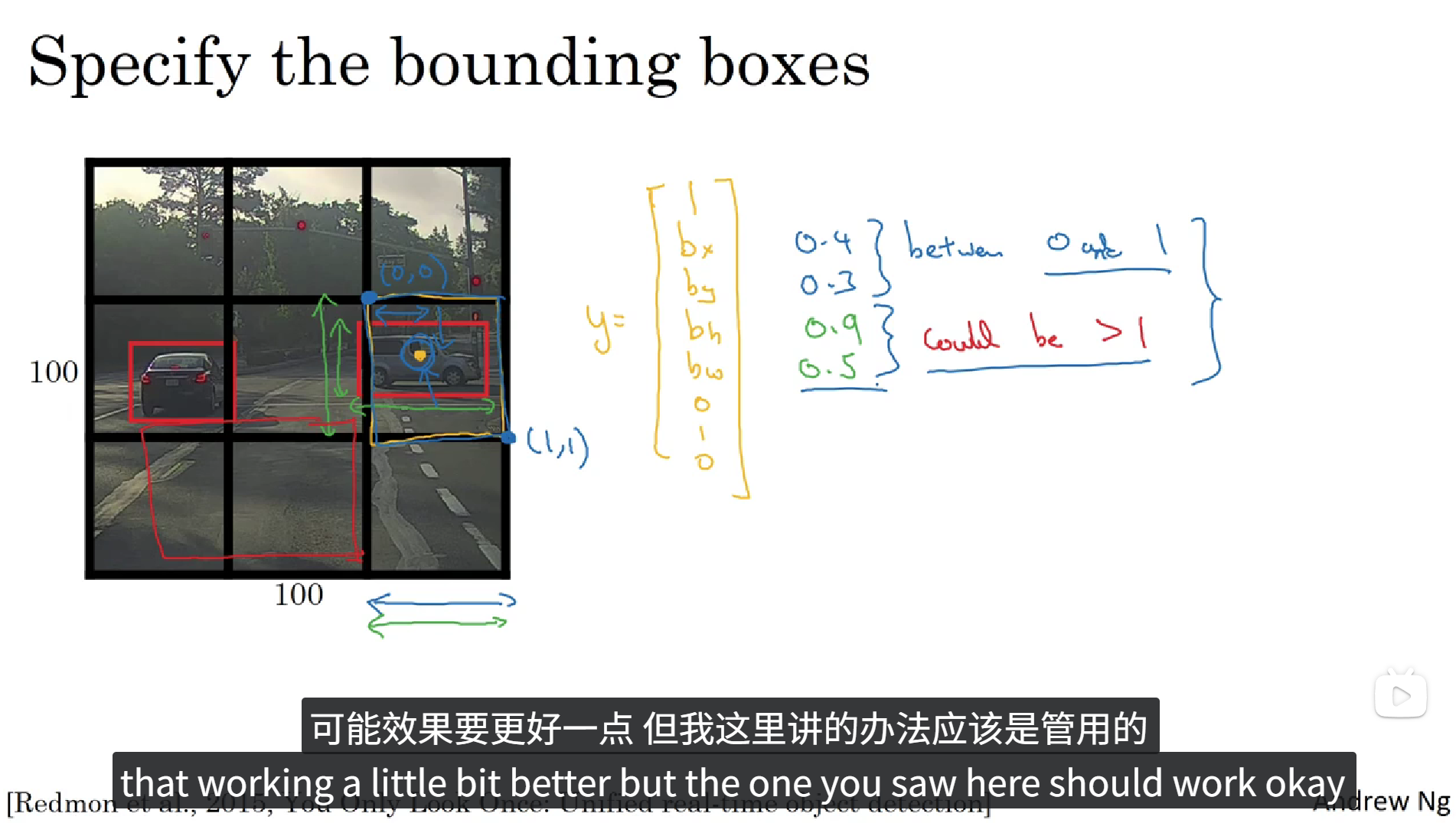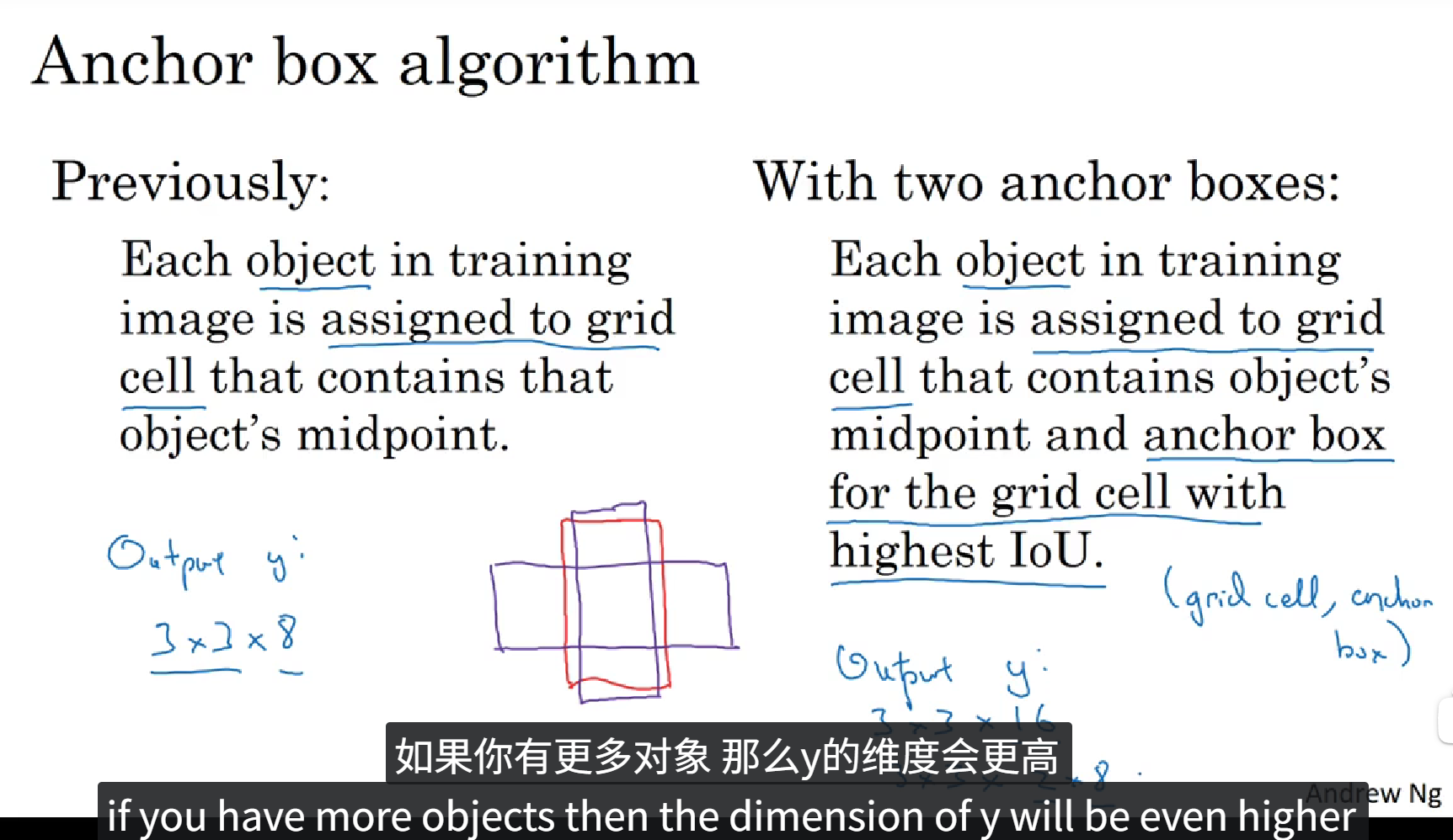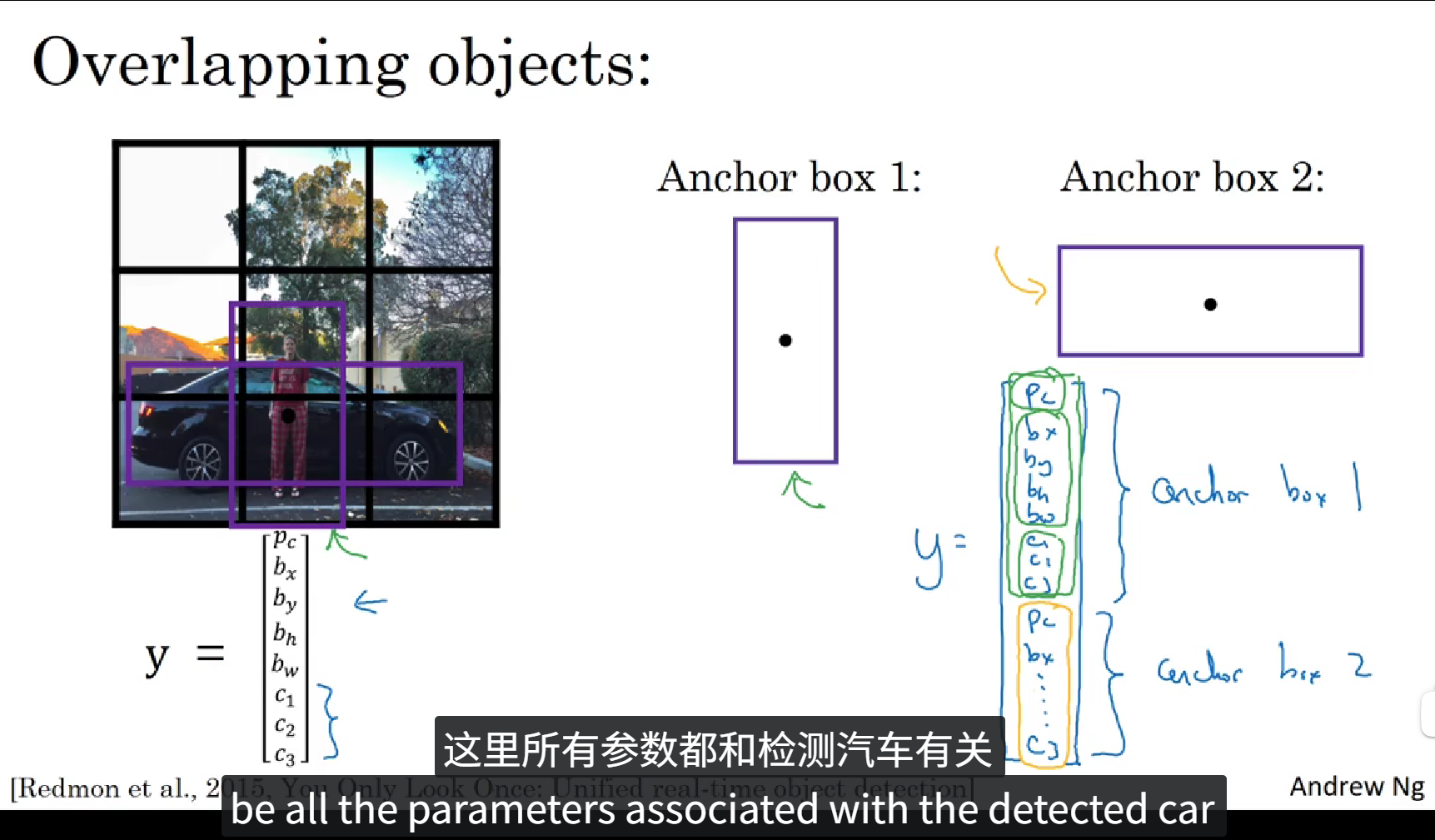 上面的PPT中定义了一个含有16个元素的训练标签,前8个元素表示 Anchor box1,后8个元素表示 Anchor box2,在图像中包含重叠的一个人和一辆车,我们根据物体的实际值框选范围和 Anchor box 的 IoU 判断出来哪个框属于哪个Anchor box,最后填充训练标签。这就是 Anchor boxes 的大致流程。当然 Anchor box 也不止两个,可以由图像中物体种类的多少自定义,当然,当目标种类越多的时候,Anchor box 的种类也就越多,同时训练标签的维度也就更高。