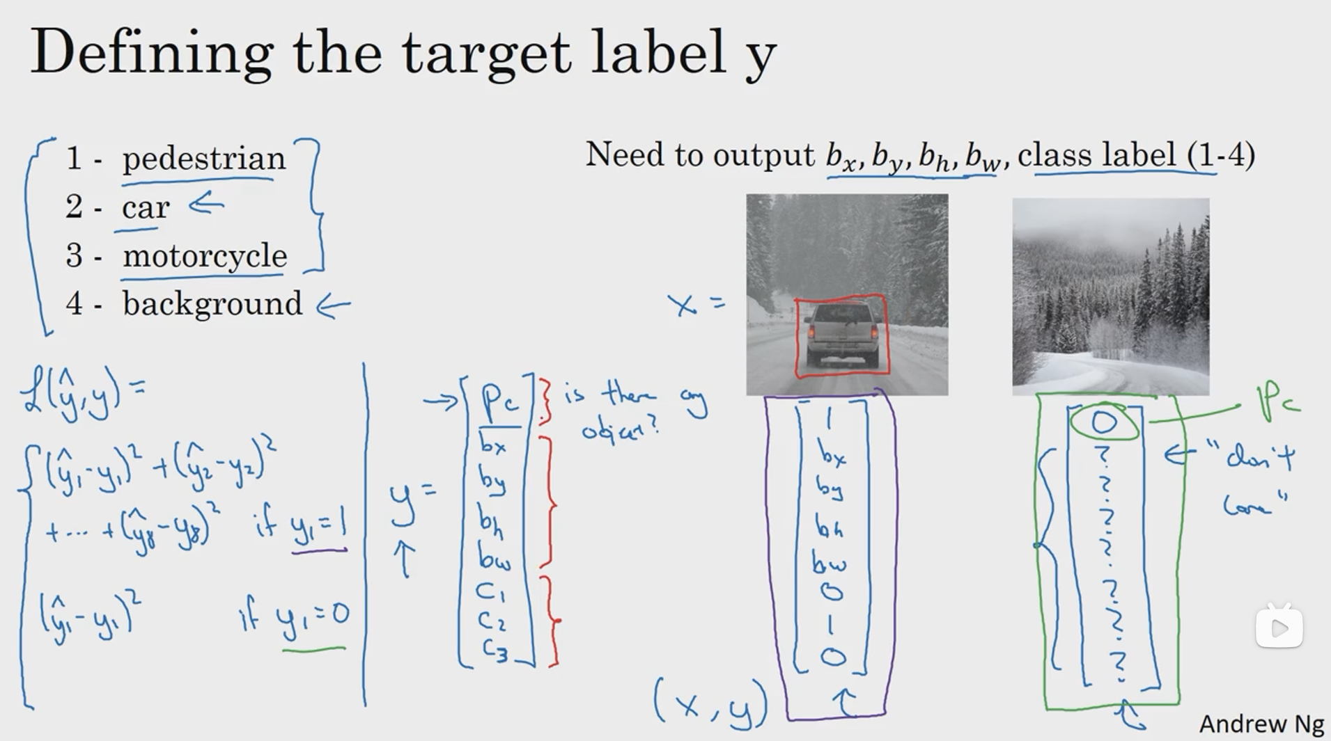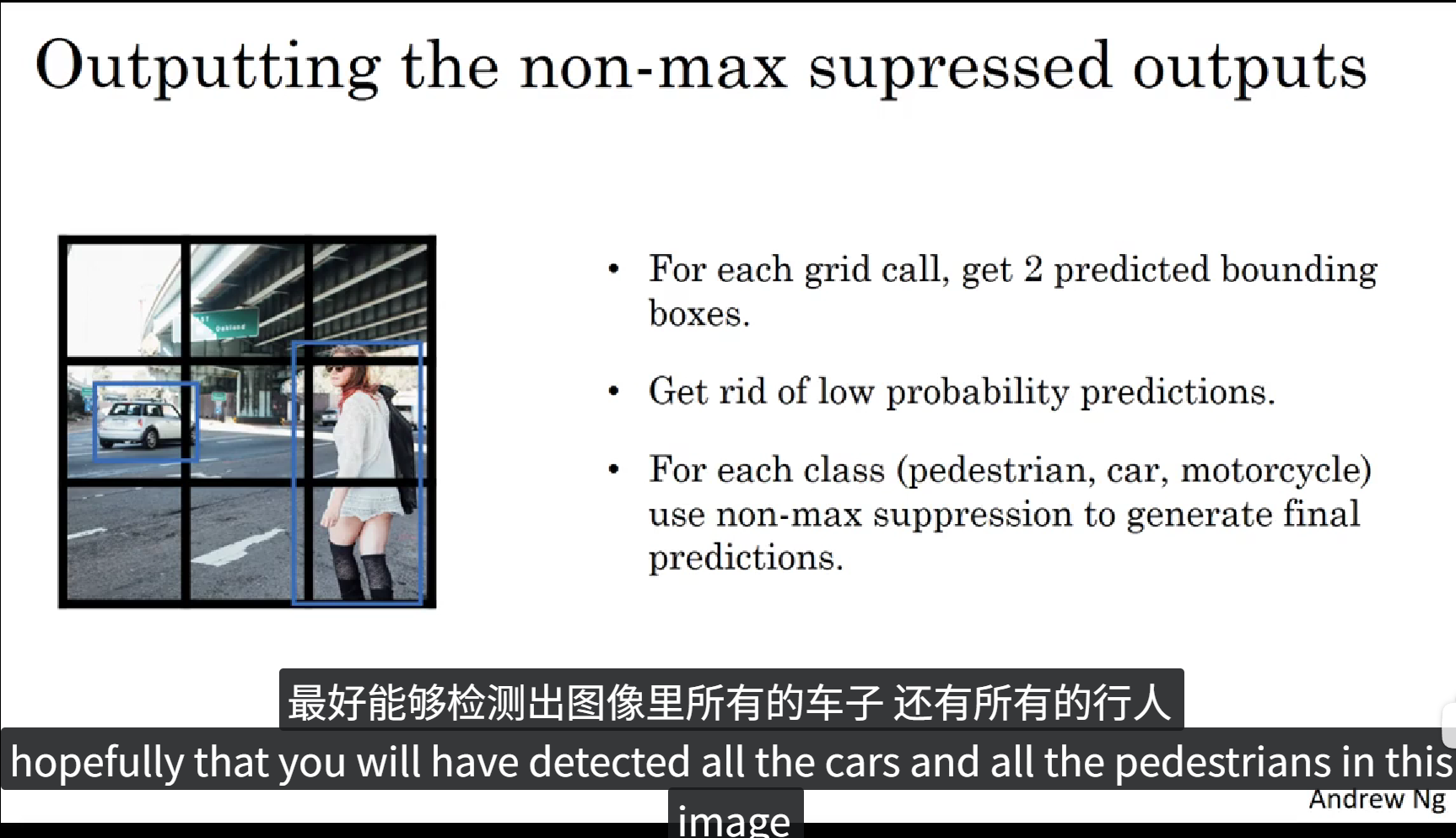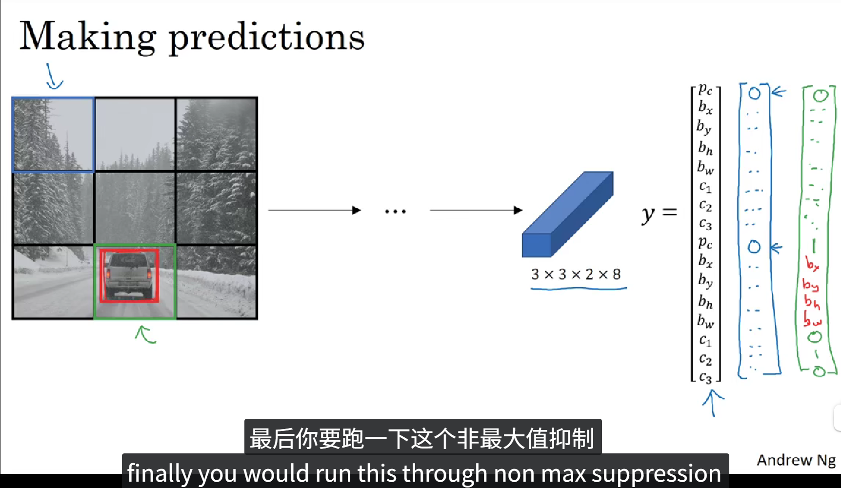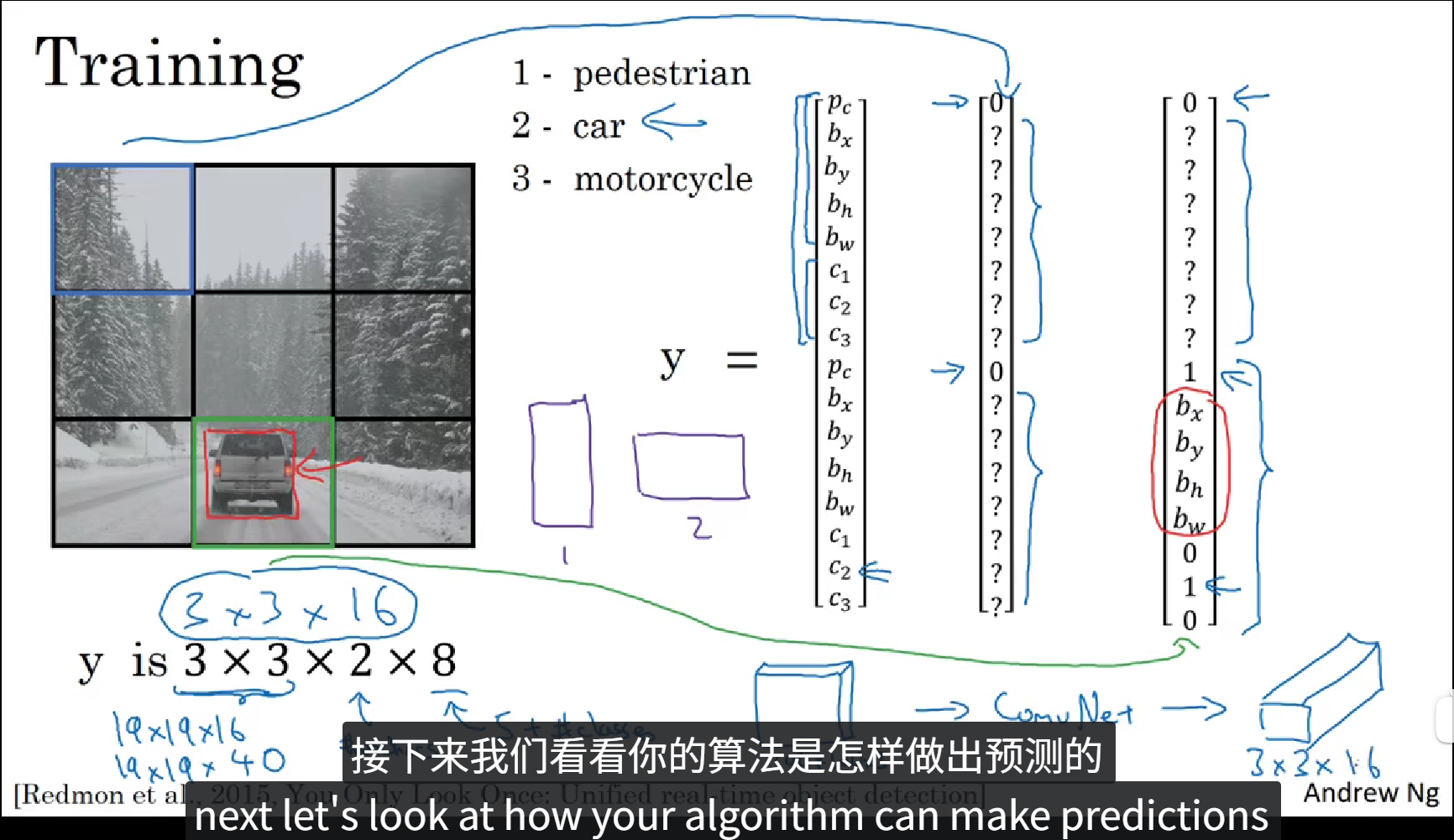 上面的PPT中定义了一个含有16个元素的训练标签,前8个元素表示 Anchor box1,后8个元素表示 Anchor box2,在图像中包含重叠的一个人和一辆车,我们根据物体的实际值框选范围和 Anchor box 的 IoU 判断出来哪个框属于哪个Anchor box,最后填充训练标签。这就是 Anchor boxes 的大致流程。当然 Anchor box 也不止两个,可以由图像中物体种类的多少自定义,当然,当目标种类越多的时候,Anchor box 的种类也就越多,同时训练标签的维度也就更高。
