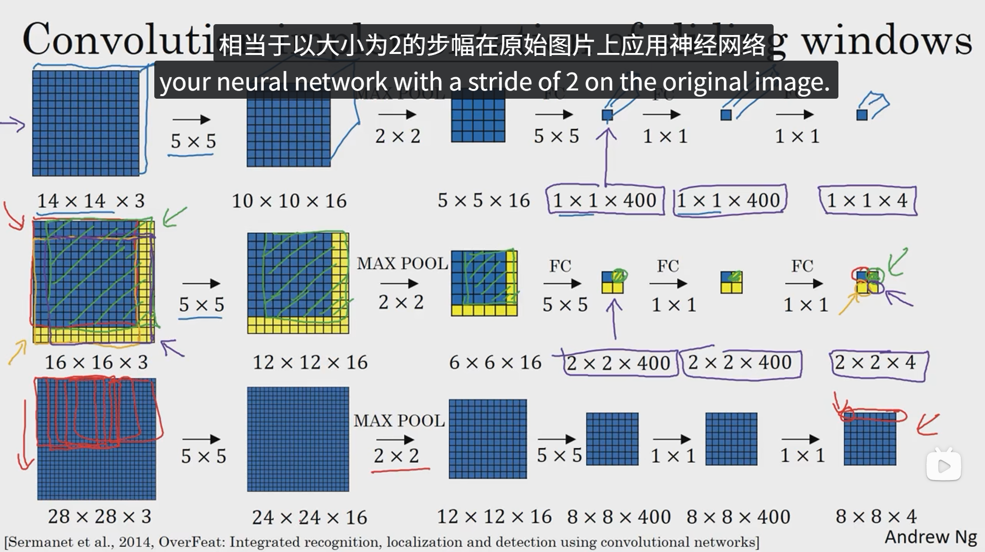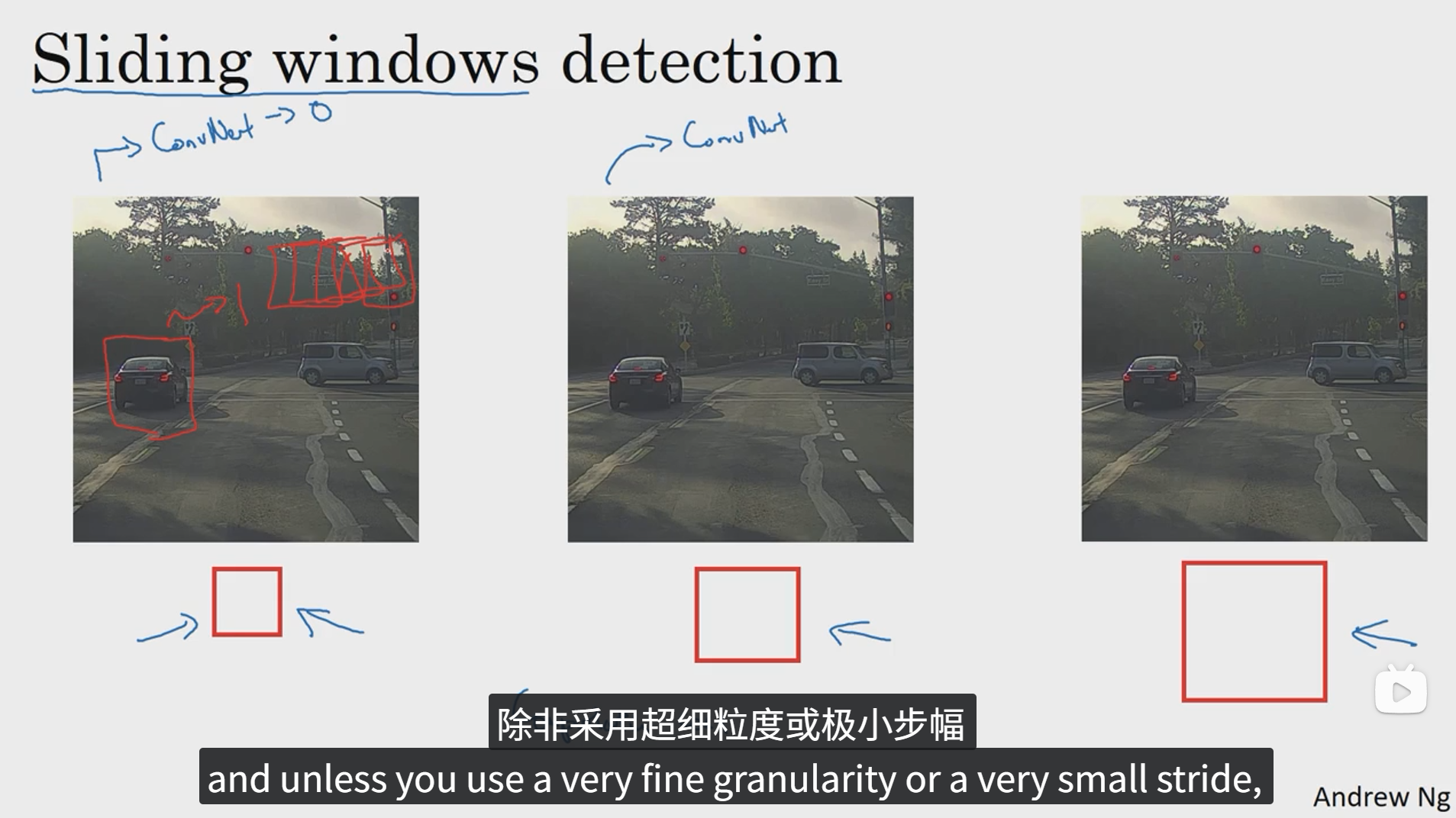 当然,这种方法存在一些缺点,就是计算成本太高,如果采用细粒度或者小步幅,检测性能可能会提高,但是由于要进行卷积处理的窗口数量太多,计算成本会很高,如果采用粗粒度或者大步幅,计算成本可能会下降,但是检测性能肯定会有所降低。