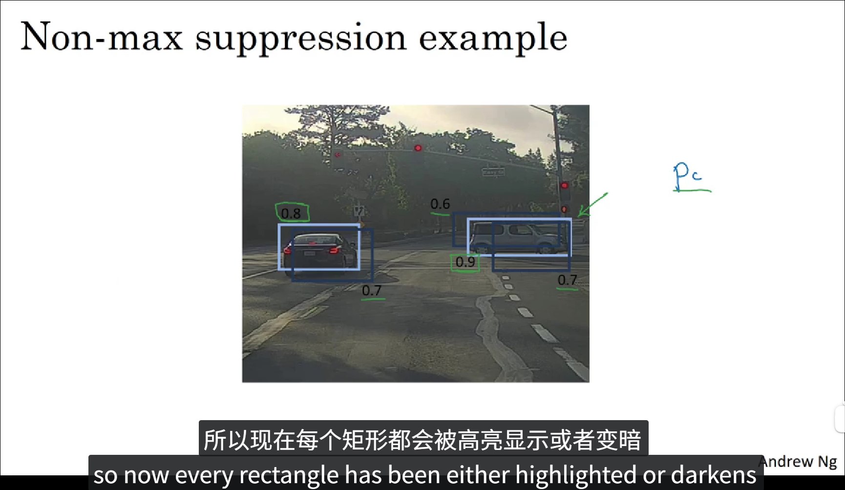 图中画出了三个不同的目标框,每个框都有自己的pc(预测值),先选取预测值最大的那个框(即亮框),然后再将这个框周围的那些与这个框交并比较高且pc值较小的目标框进行抑制(即暗框)。这就是非极大值抑制,你只需要输出概率最大的分类结果。
