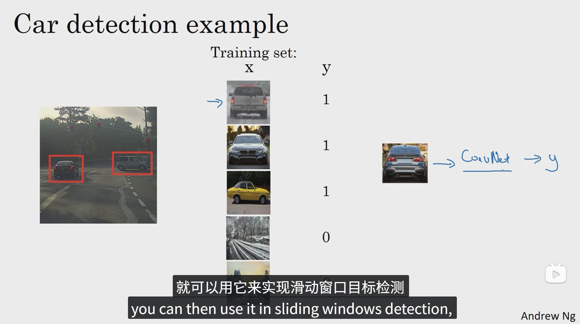 我们可以先输入一些适当剪切后的汽车识别的正负样本,然后把他们丢进卷积神经网络中进行训练,从而得到一个训练好的网络。下面我们就可以利用这个网络去实现滑动窗口目标检测。