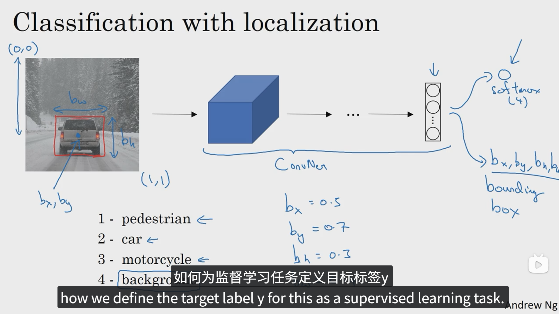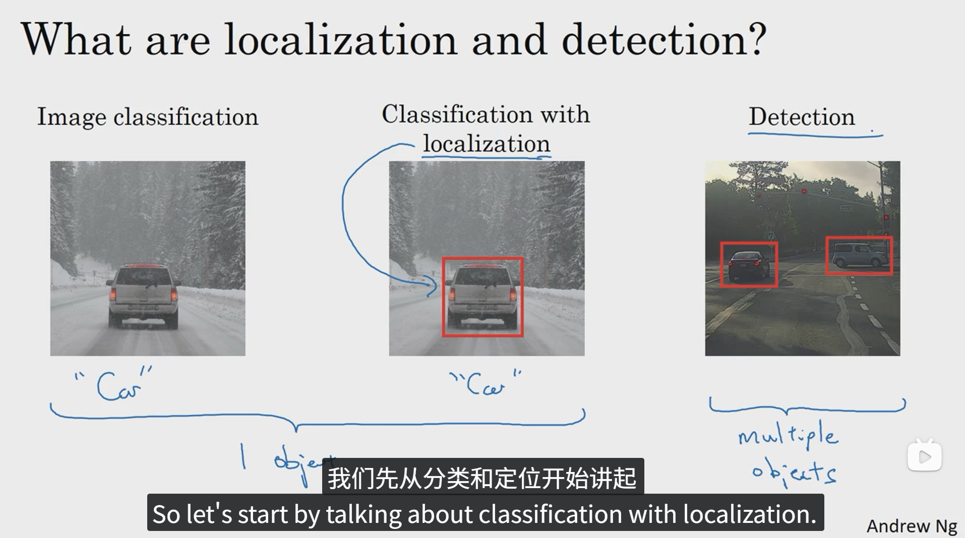 图像分类任务我们已经很熟悉了,就是用算法遍历图片,判断其中的对象是不是汽车,这就是图像分类。下面我们要学习构建神经网络的另一个问题,即定位分类问题。这意味着我们不仅要用算法判断图片中是不是一辆汽车,还要在图像中标记出它的位置,用边框或者红色方框把汽车圈起来,这就是定位分类问题,其中"定位"的意思是判断汽车在图片中的具体位置,后面我们再讲讲当图片中有多个对象的时候应该如何检测他们并确定出位置。比如,你正在做一个自动驾驶的程序,程序不但要检测其他车辆,还要检测其他对象,如行人、摩托车等等。本章我们要研究的定位分类问题通常只有一个较大的对象位于图片的中间位置,我们要对它进行识别和定位,而在对象检测问题中,图片可以含有多个对象,甚至单张图像中会有多个不同分类的对象,因此,图像分类的思路可以帮助学习分类定位,而目标定位的思路又有助于学习目标检测,我们首先从分类和定位开始讲起。
