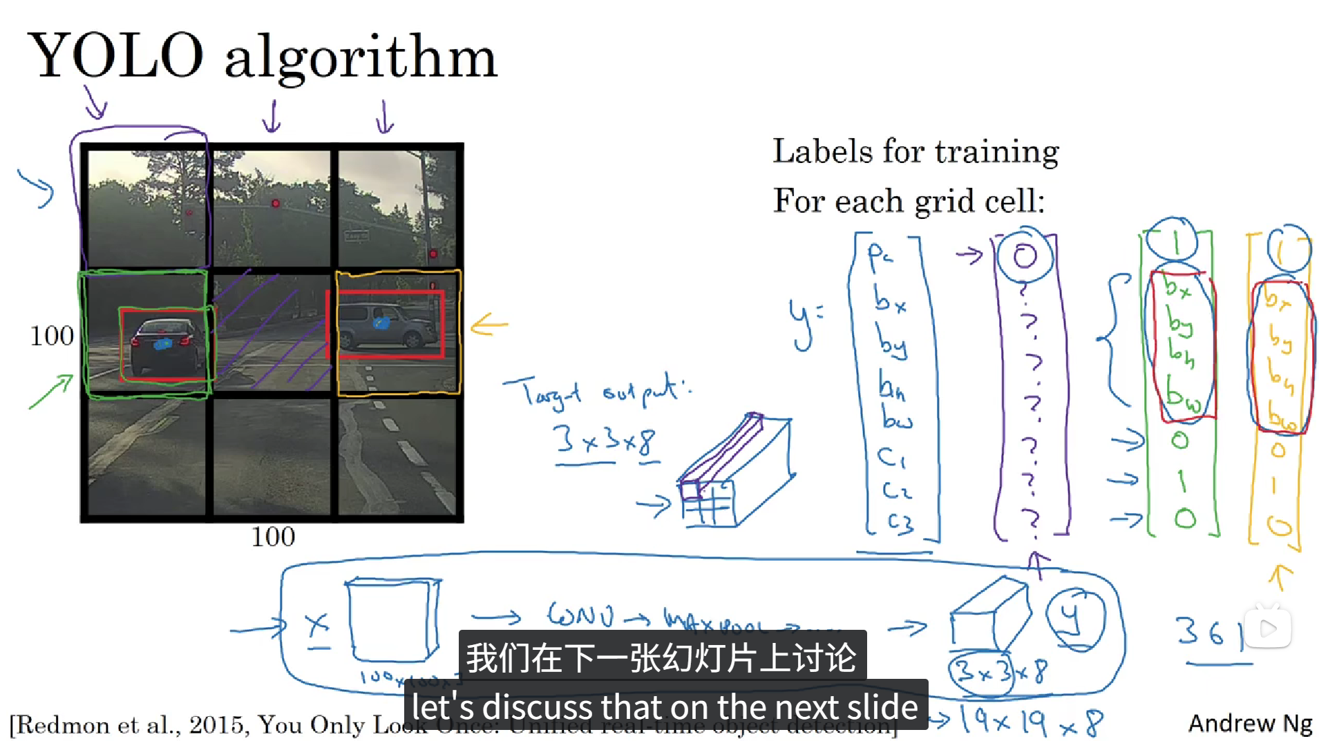正如上面所说,YOLO算法会先将图像分为N个格子,上面的图中我们把它分成了9个格子,然后将整张图像丢入卷积神经网络,利用相同的卷积核只跑一次,预测标签和之前的相似,Pc为置信度,bx, by, bh, bw分别为待识别物体相对于本个格子的相对坐标和大小,每个格子具有一个这样的标签,所以卷积最终的输出的大小就是 3x3x8。这种算法会大大提高边框的准确性。