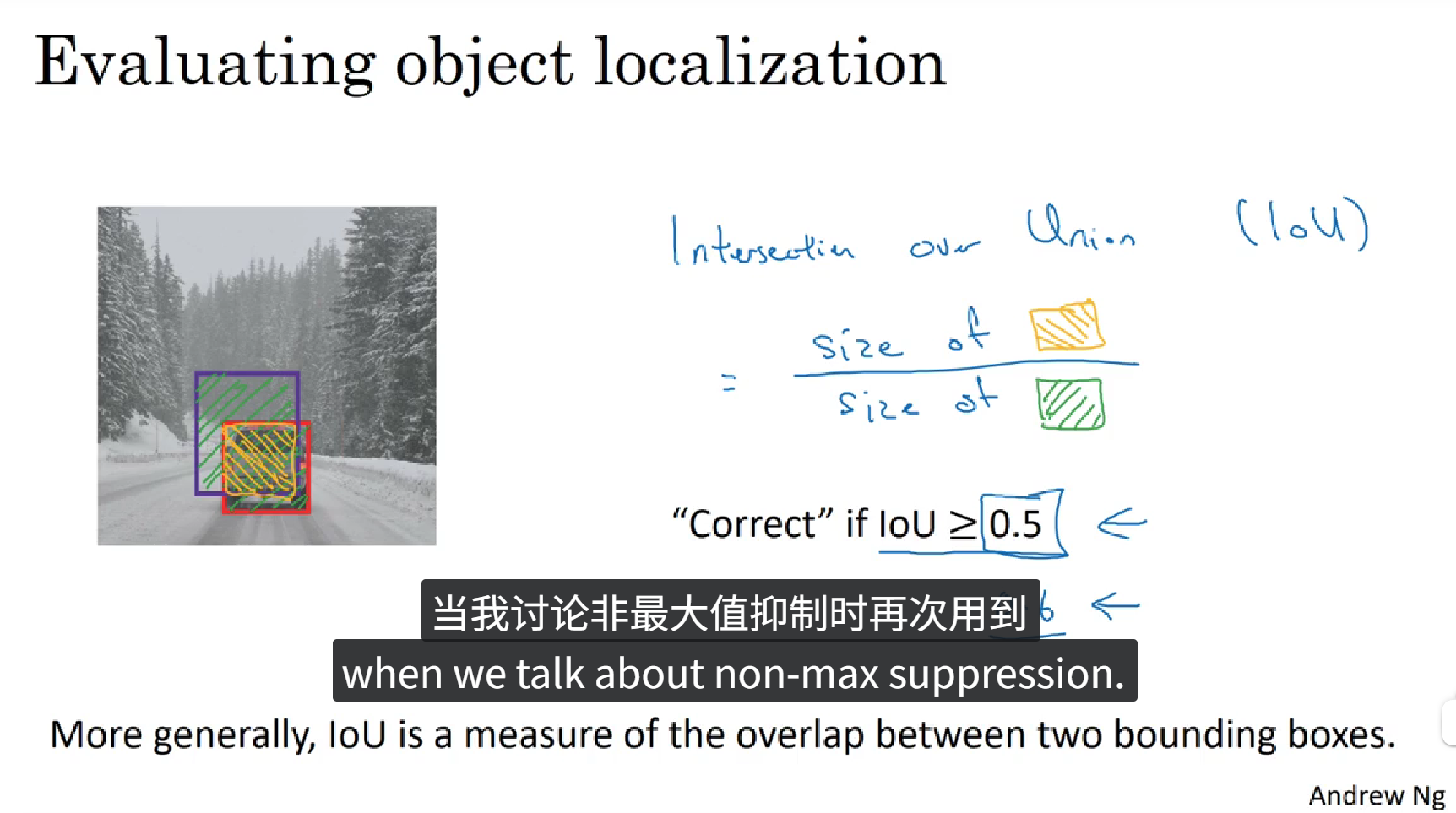 在目标检测算法中,你希望能够同时定位对象,所以如果实际边界框是这样的,你的算法给出这个紫色的边界框,那么这个结果是好还是坏,所以交并比(IoU)函数做的是计算两个边界框交集和并集之比。那么交并比就是计算交集的大小,即这个橙色阴影面积,然后除以绿色阴影的并集的面积。一般约定,在计算机检测任务中,如果IoU大于或者等于0.5就说明检测正确,如果预测器和实际边界框完美重叠,则IoU就是1,因为交集就等于并集。但一般来说,只要IoU大于等于0.5,那么结果就是可以被接受的,一般约定0.5是阈值,IoU越高,预测越准确。除此之外,这个阈值是人为设定的,可以由你来设定,如果你想对精确性要求严格一点,可以适当进行提高。