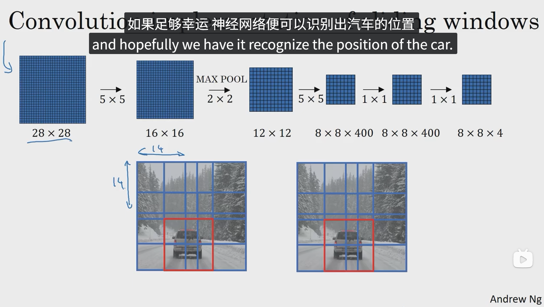 如上图,如果对一张图像单独剪切图像的一部分进行卷积操作,然后重复此过程,可能会导致很多公共区域重复计算,所以我们就索性直接对整张图片进行卷积操作,然后对每部分该剪切下来的图像进行分块映射,最终可以在输出结果中找到每块窗口对应的输出值,这样就能省去很多重复计算,这就是卷积的滑动窗口实现。这样可以大大提高滑动窗口的效率。