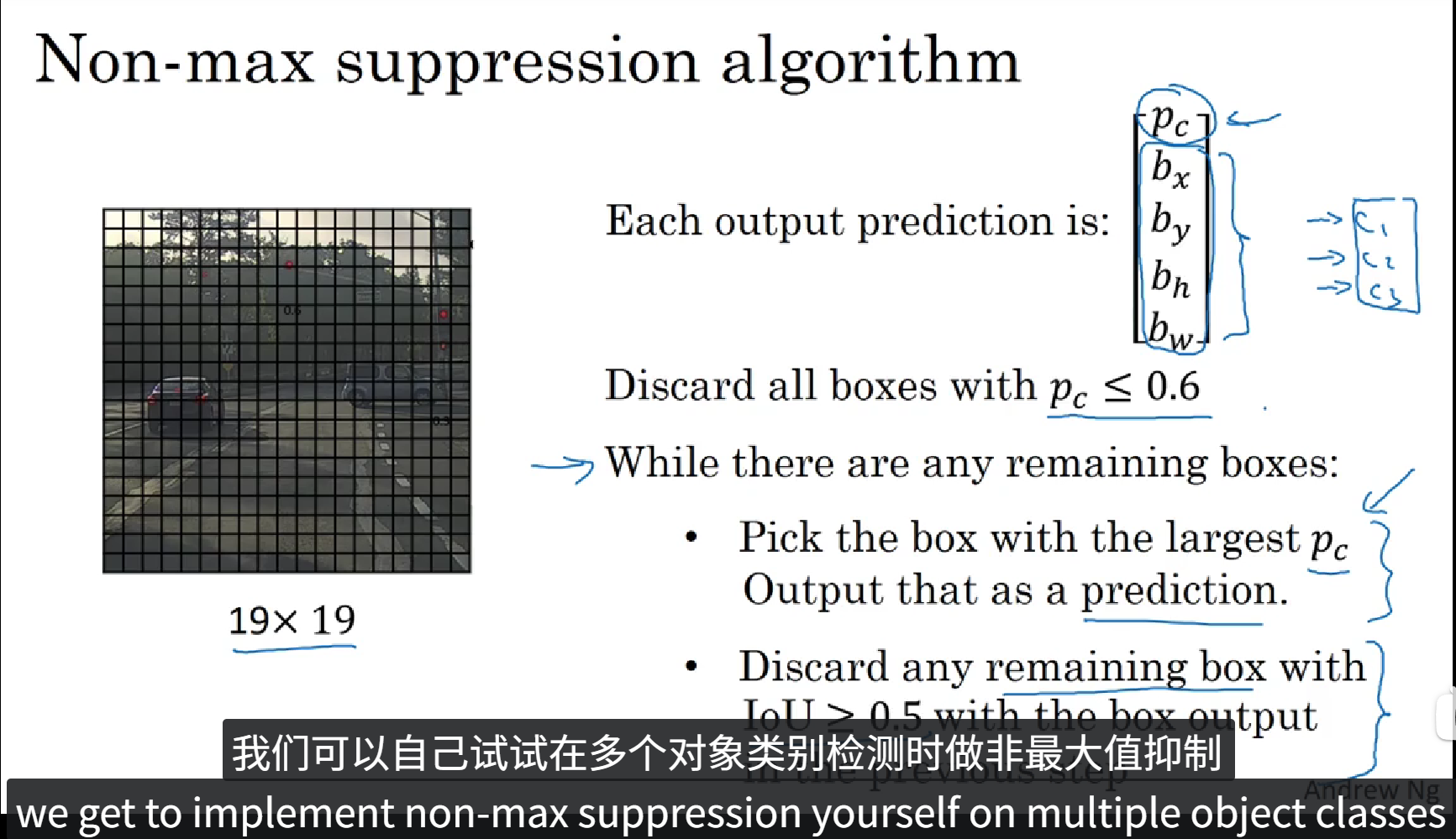 这是一个非极大值抑制的例子,大概过程是这样的,首先,我们先去除 pc <= 0.6 的边界框,然后逐一检测剩余的边界框,首先在剩下的边界框中挑选出 pc 最大的,然后对于除了这个框之外的和这个框的 IoU > 0.5 的边界框再次进行去除,重复上述过程,知道只剩下 pc 最大的边界框,这就是非极大值抑制的大致过程。