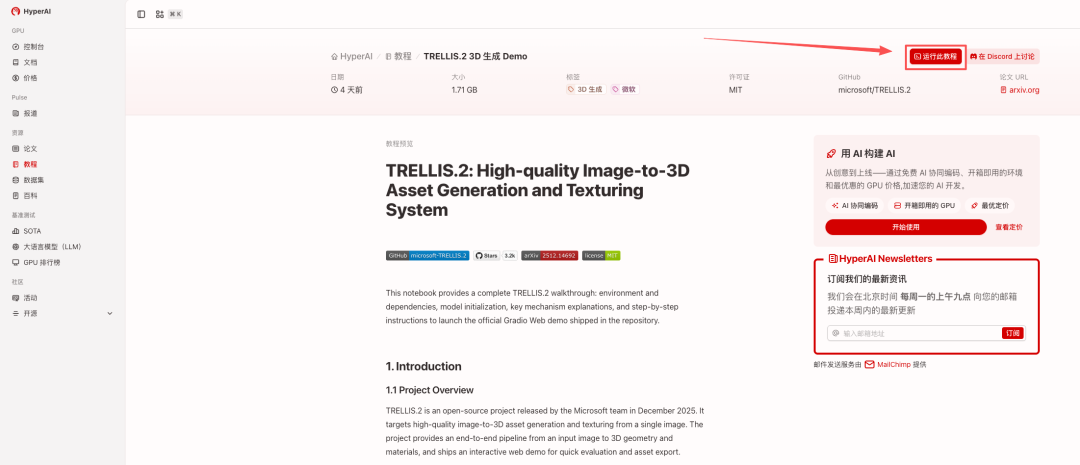 1.进入 hyper.ai 首页后,选择「TRELLIS.2 3D 生成 Demo」,或进入「教程」页面选择。页面跳转后,点击「在线运行此教程」。