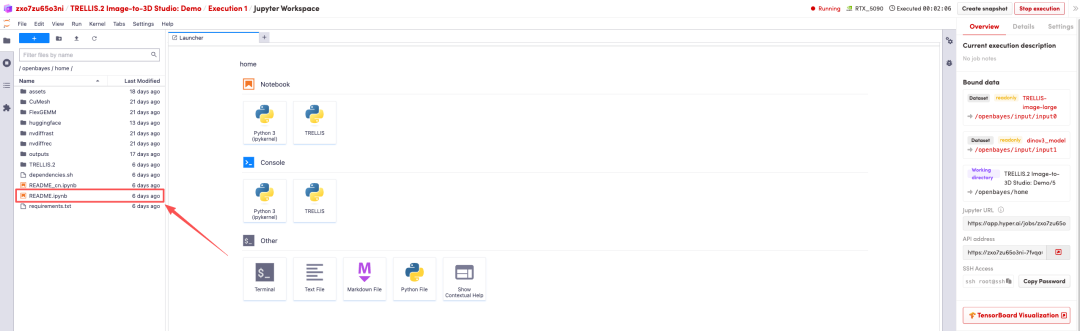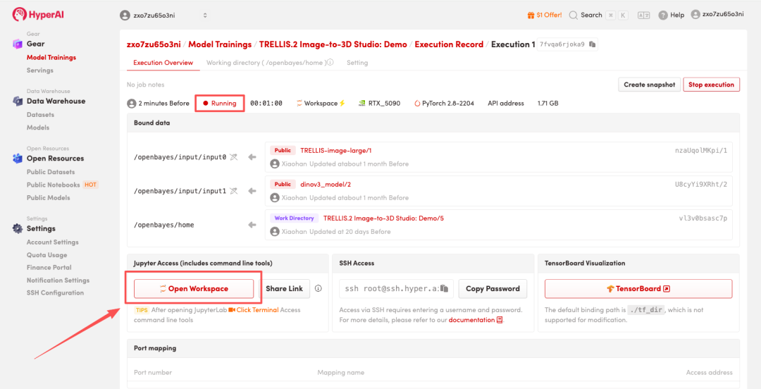 4.等待分配资源,当状态变为「Running(运行中)」后,点击「Open Workspace」进入 Jupyter Workspace。