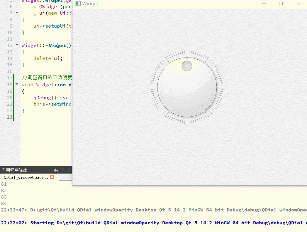 我们可以通过它来实现一个小功能,通过旋转来调节我们的不透明度(1是完全不透明,0是完全透明),这就涉及到前面的知识了,也就是Widget的函数setWindowOpacity