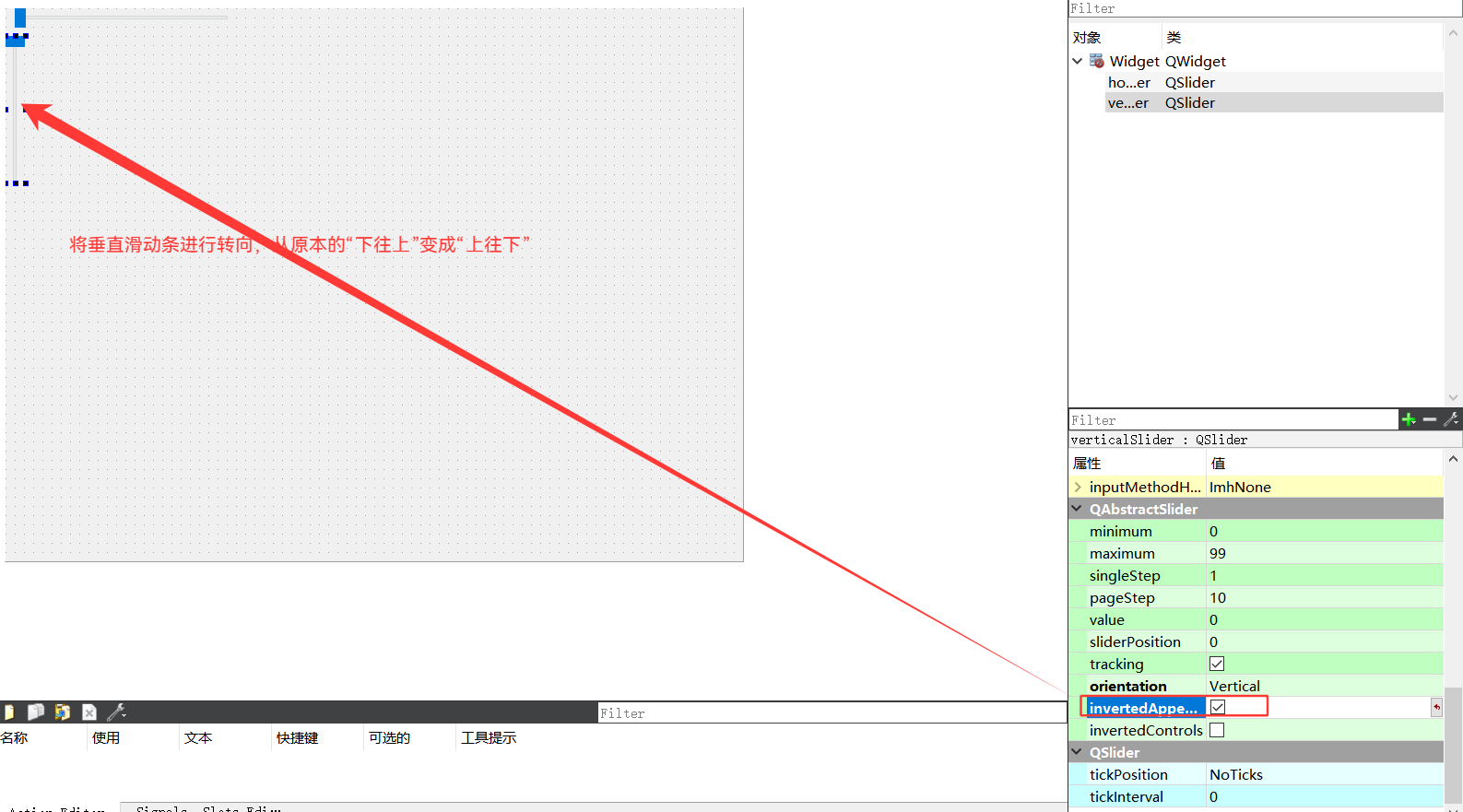 | void setInvertedAppearance(bool) | 设置是否要翻转滑动条的⽅向 |
