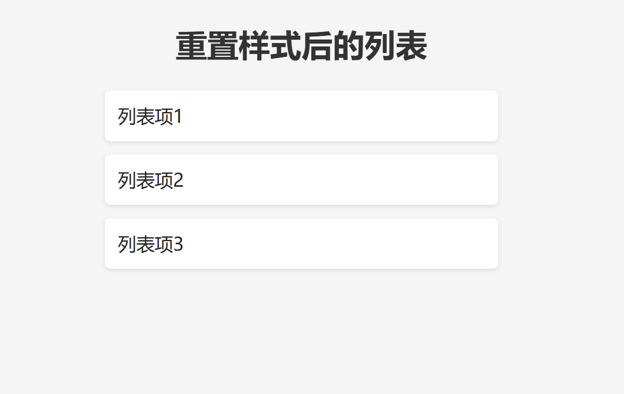 效果:body无默认外边距,ul无默认内边距和圆点,列表项整洁排列,在所有浏览器中表现一致。