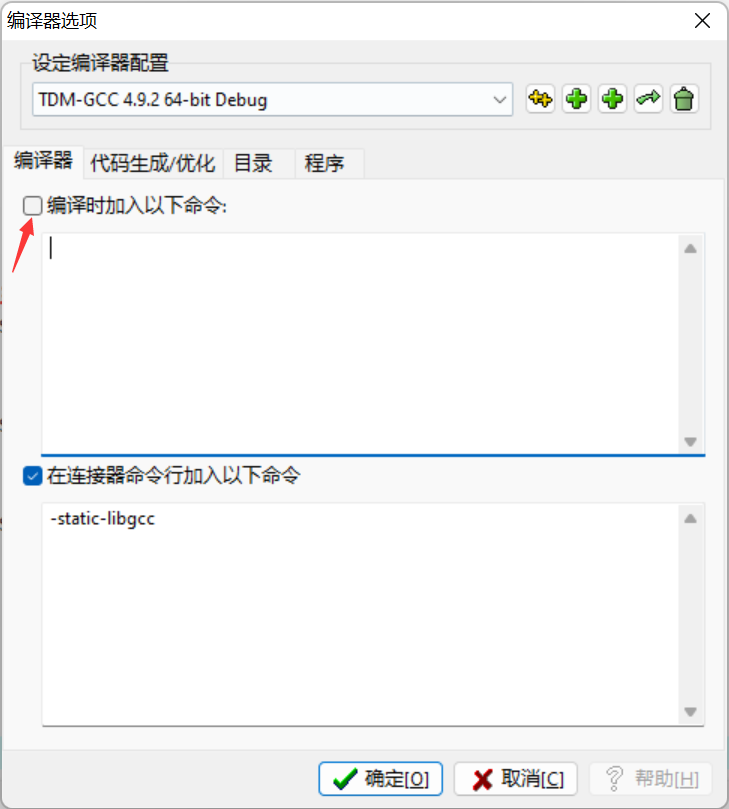出现上述窗口时,勾选【编译时加入以下命令】,然后在下方的编译框加上:-std=c++11即可解决此类问题。