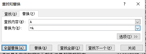 点击某一个单元格,选择替换。在替换对话框中将"查找内容"和"替换为"分别输入A和=A,如下所示: