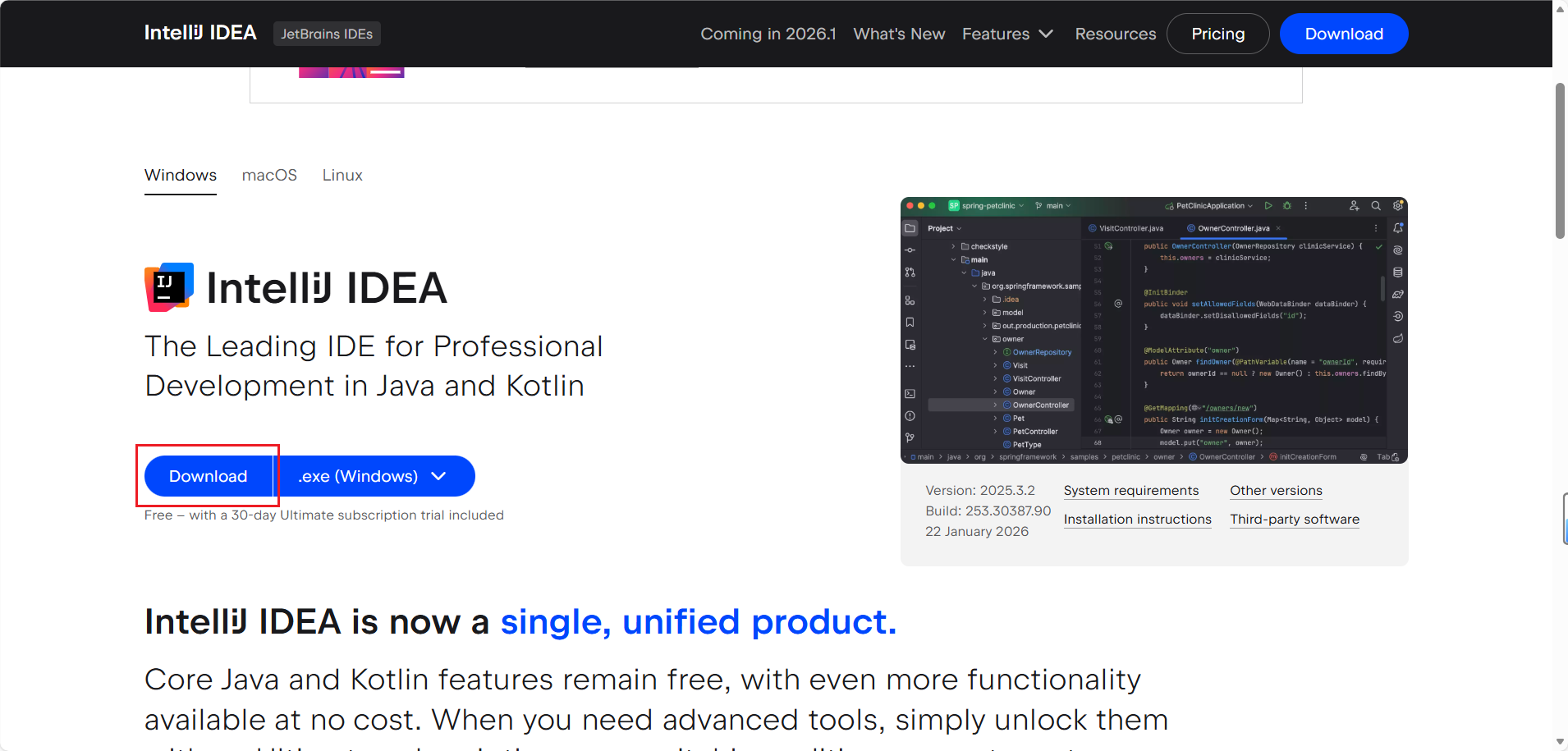 自 2025.3 起,IntelliJ IDEA 已整合为统一产品(不再区分 Community 和 Ultimate 两个独立安装包):