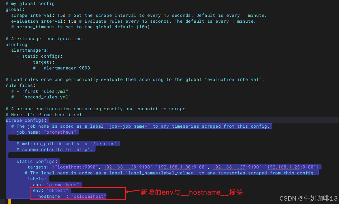 如:给job_name为prometheus新增标签【env】【hostname】内容:
