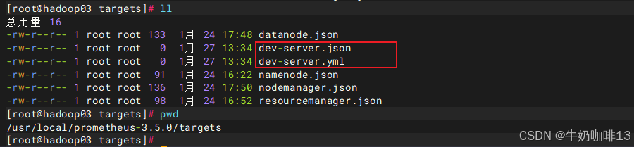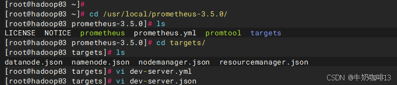 或者可以在【/usr/local/prometheus-3.5.0/targets】路径下创建一个yaml格式的服务发现文件【dev-server.yml】(注意:若内容相同,则.json与.yml格式的文件只需创建任意一种格式的文件即可,不用两个都创建)。