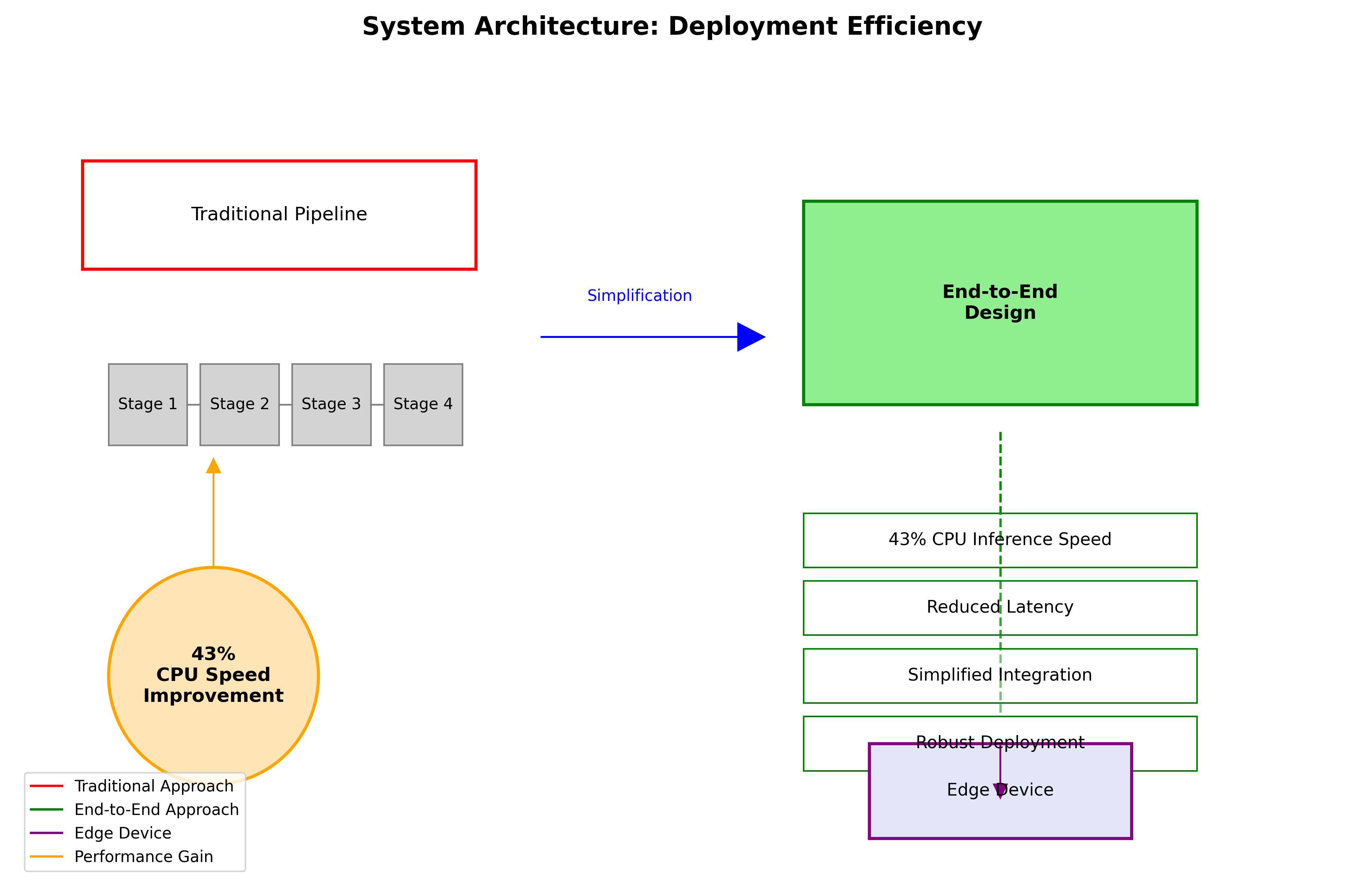 部署效率(Deployment Efficiency)方面,端到端设计消除了管道的整个阶段,大大简化了集成。减少了延迟,使部署在各种环境中更加稳健。CPU推理速度提升高达43% ,这对于资源受限的边缘设备来说是一个巨大的进步!💪