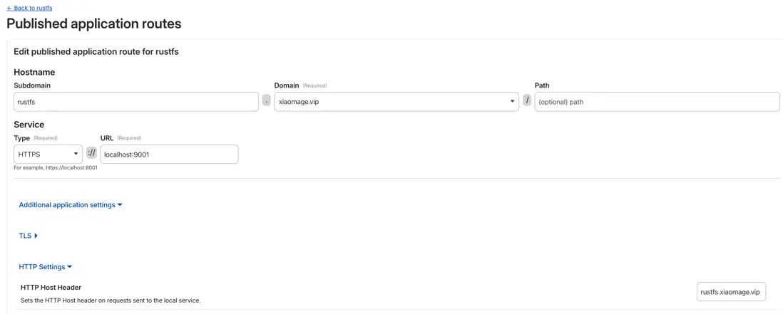 在 Hostname 和 Service 设置页面的 Additional application settings 部分,点击 HTTP Settings ,在 HTTP Host Header 部分,输入访问 RustFS 的域名,这是为了避免后续使用出现签名错误。
