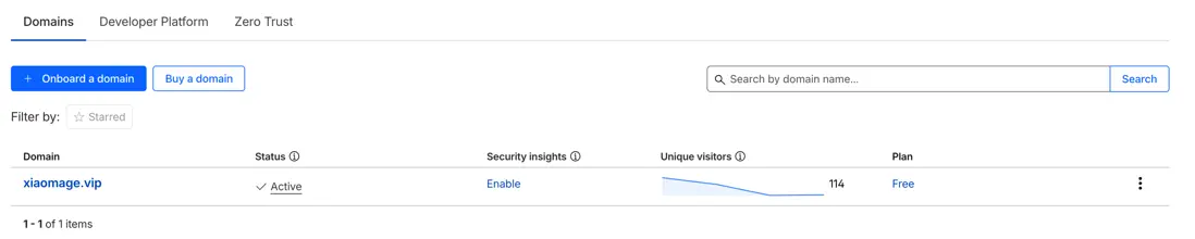 - 如果一切顺利,可以在域名管理首页看到添加成功的域名,其 Status 会显示为 Active。
