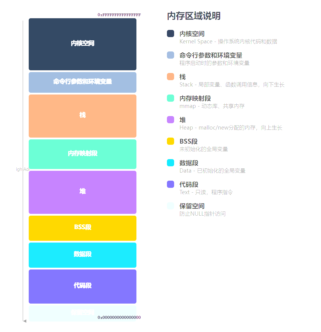 当一个进程启动时,操作系统会为它分配一个"背包",里面装着它需要的所有东西。这个背包按区域划分: