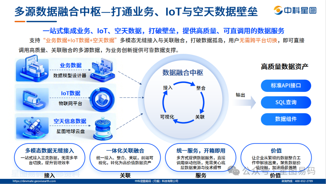 现代应用已不再局限于简单的业务增删改查。在工业互联网、智慧城市等领域,应用需要同时处理业务数据、IoT物联网设备数据,甚至复杂的空天遥感数据。以星图云开发者平台为例,它通过数据模型设计器实现业务数据的零代码建模与全链路管控,内置物联网平台实时接入与处理设备数据,并深度集成星图地球云盘,提供遥感影像等空天信息的即取即用。平台将多源数据进行可视化关联与融合,形成统一的数据服务,使开发者能够直接调用高质量、关联融合的数据资产,无需跨平台切换或关注底层技术细节。这种业务数据、IoT数据与空天信息的一体化集成能力,是低代码支撑行业级复杂场景的关键。
