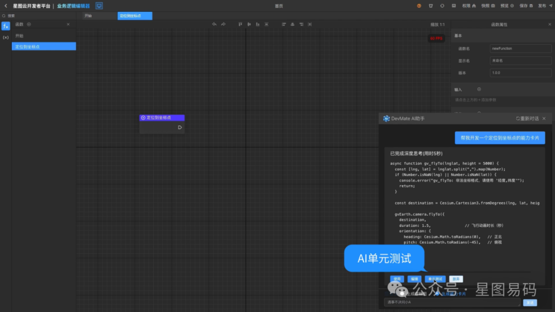 为此,星图云开发者平台在引入AI辅助开发时,始终将"人在回路"作为核心设计原则。平台不仅利用大语言模型实现代码补全、能力卡片与业务逻辑图的自动生成,更通过内置的AI单元测试和人工校准机制,对AI产出进行严格验证与复核。这使得开发者在享受智能化提效的同时,能有效管控风险,让AI成为可靠、可控的智能副驾驶,真正实现人机协同的安全开发。