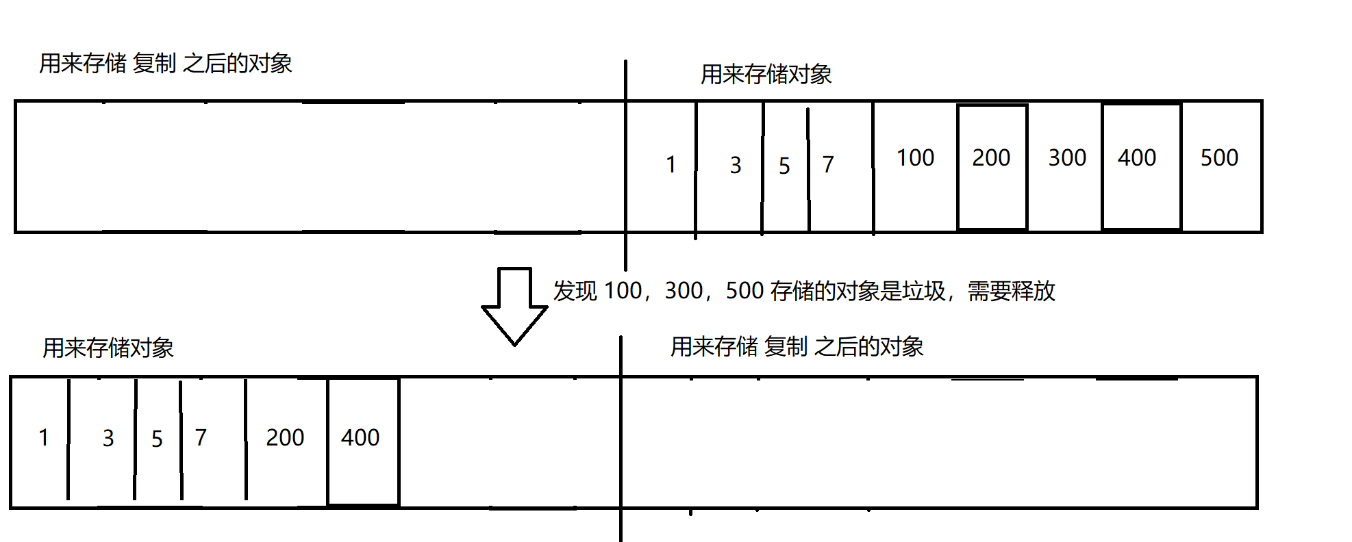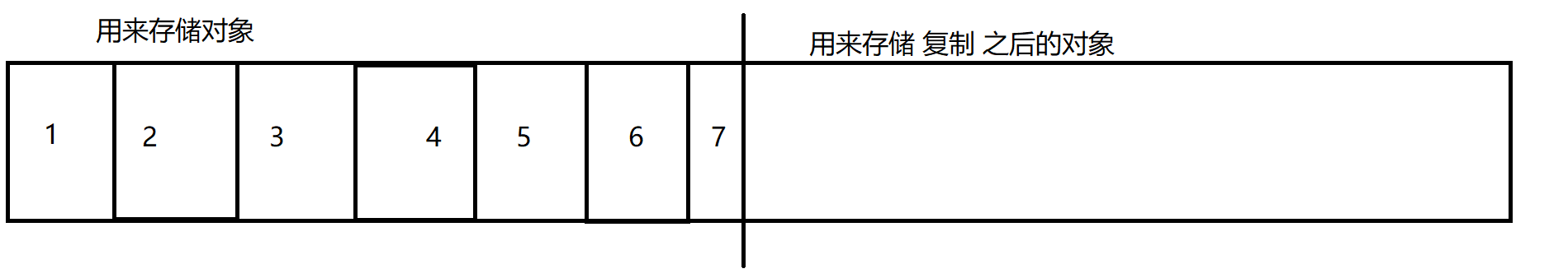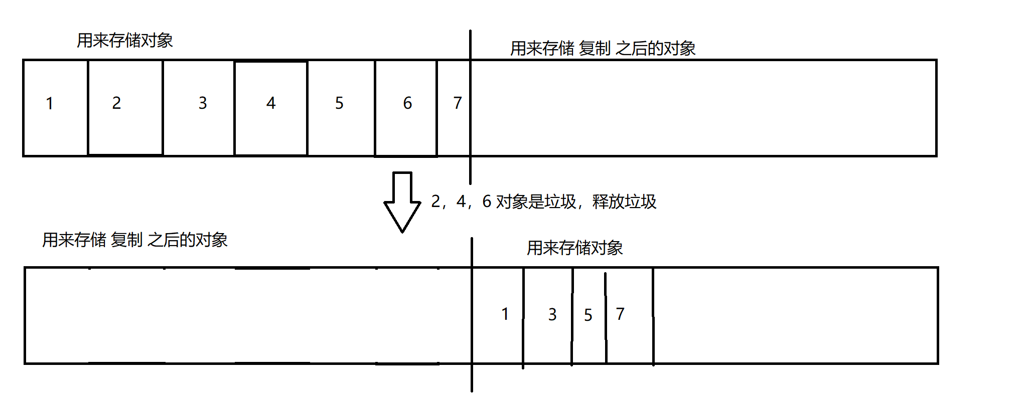 需要进行垃圾释放 时,把不是垃圾的对象,拷贝(复制)到另一半内存空间 ,然后把这一侧的空间,全部释放掉。