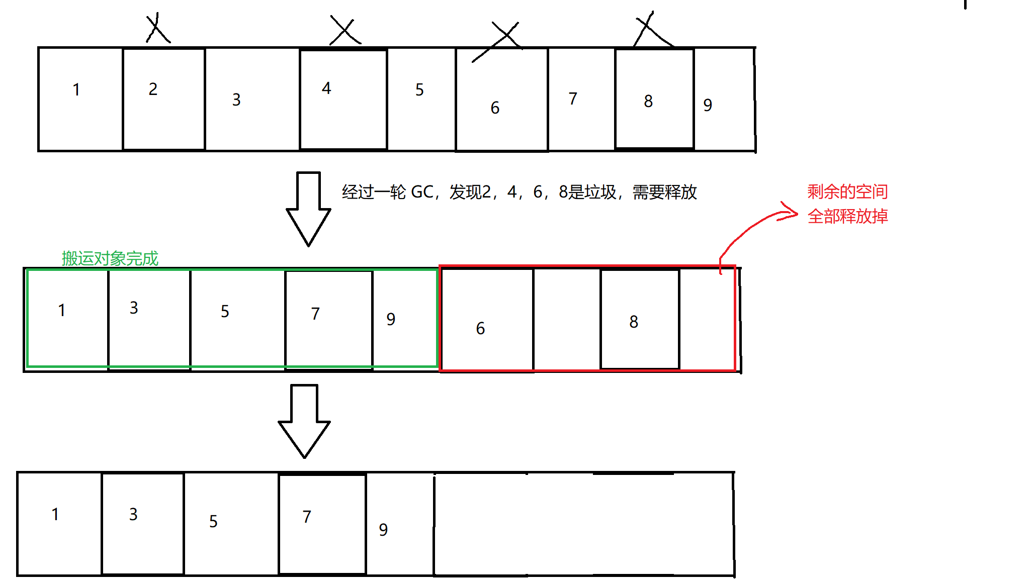经过一轮 GC,发现2,4,6 存储的对象是垃圾,需要释放