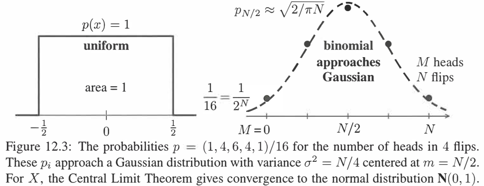 Figure 12.3 展示了 N = 4 N=4 N=4 次抛掷时正面出现 0 , 1 , 2 , 3 , 4 0,1,2,3,4 0,1,2,3,4 次的概率如何近似于一个钟形(高斯)曲线的,这个高斯分别以均值 N = N 2 N=\dfrac{N}{2} N=2N 为中心。要得到一个标准高斯分布(均值为 0 0 0,方差为 1 1 1),我们需要对图形进行平移和伸缩。如果 x x x 是 N N N 次抛投中出现正面的次数,则 N N N 个 0 − 1 0-1 0−1 分布结果的平均值,将 x x x 按均值 m = N 2 m=\dfrac{N}{2} m=2N 平移且按 σ = N 2 \sigma=\dfrac{\sqrt N}{2} σ=2N 进行伸缩来得到标准化的 X X X: