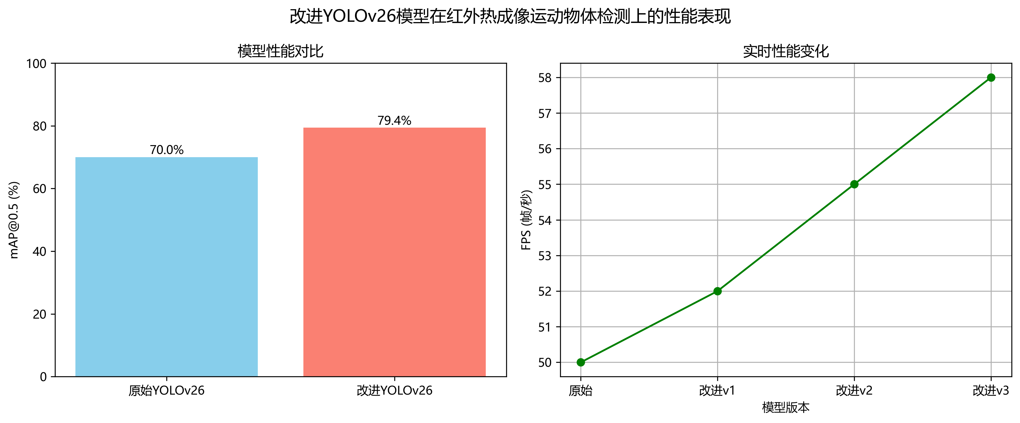 实验结果表明,改进后的YOLOv26模型在红外热成像运动物体检测任务上取得了优异的性能,mAP@0.5达到79.4%,FPS达到58。这为自动驾驶系统在复杂环境下的安全运行提供了有力的技术保障。
