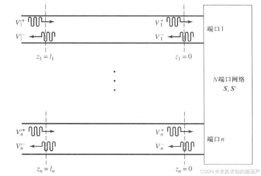 式中θn=βnℓn\theta_{n}=\beta_{n}\ell_{n}θn=βnℓn是第n个端口的参考平面向外移动的电长度,Vn+Vn−V_{n}^{+}V_{n}^{-}Vn+Vn−为两个列向量。