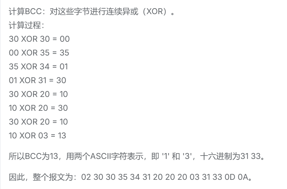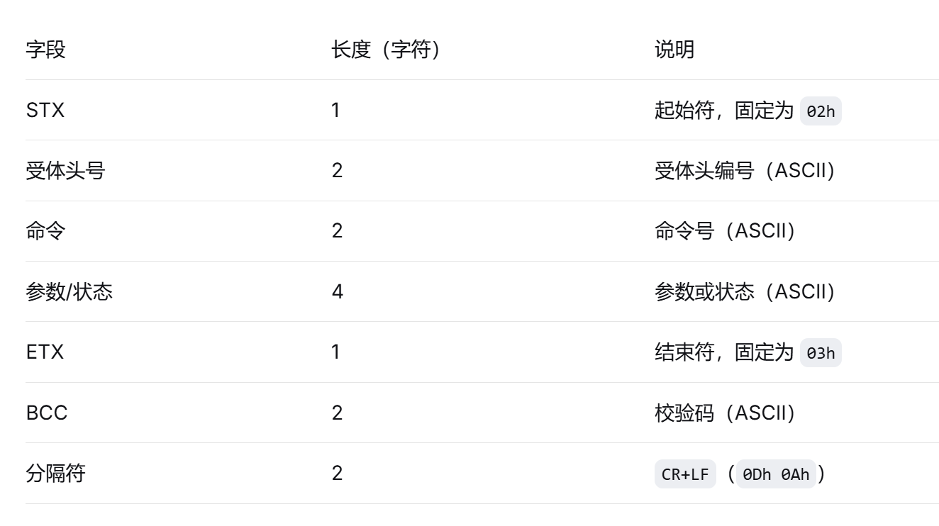 根据文档中每个命令的格式,按照规定的字段(受体头编号、命令、参数等)构造出ASCII字符串,然后计算BCC,最后加上STX、ETX和分隔符,转换成十六进制表示。