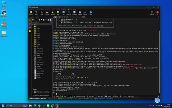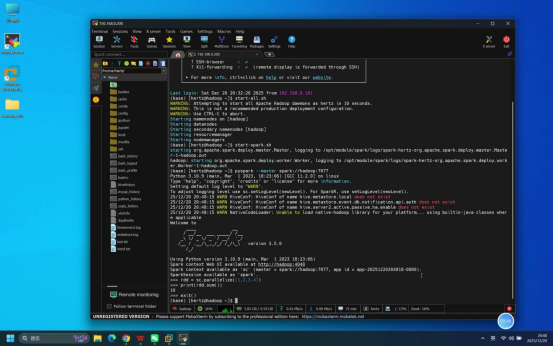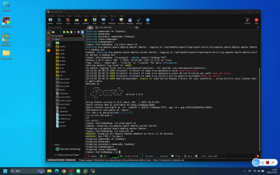 操作说明:回到Mobaxterm终端,启动Spark Python交互模式,执行简单命令验证交互功能可用性。
