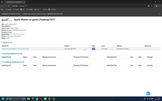 操作说明:打开本地浏览器,输入Spark WebUI访问地址,验证Spark Master服务状态。