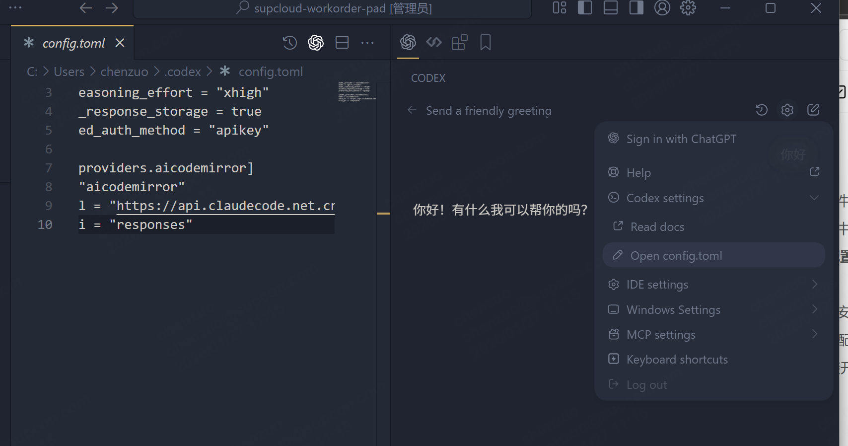 安装后可以看到系统路径下多了一个 .codex文件夹,我们可以在其中配置自己的 key,代理的地址等等