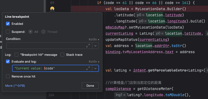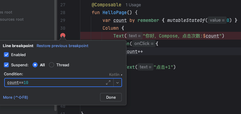 Condition输入框中写 Kotlin/Java 表达式(如count == 10)。 - 效果 :只有当表达式为