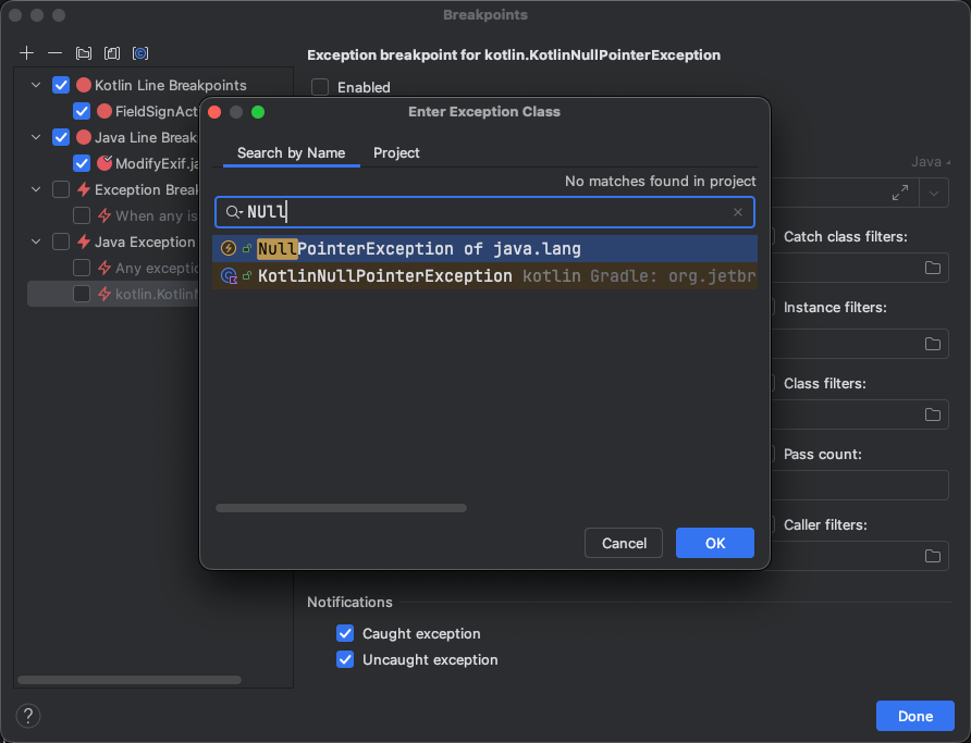 Ctrl+Shift+F8/Cmd+Shift+F8)中,点击+号 ->Java Exception Breakpoints。 - 效果:当发生特定异常(即使被捕获)时,调试器会自动暂停在抛出异常的那一行。