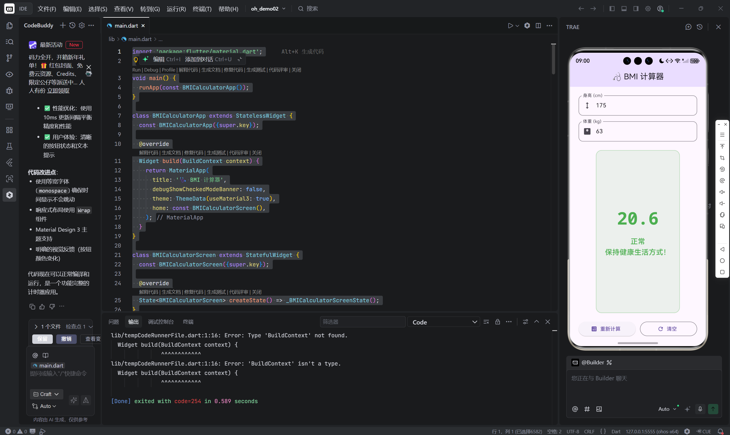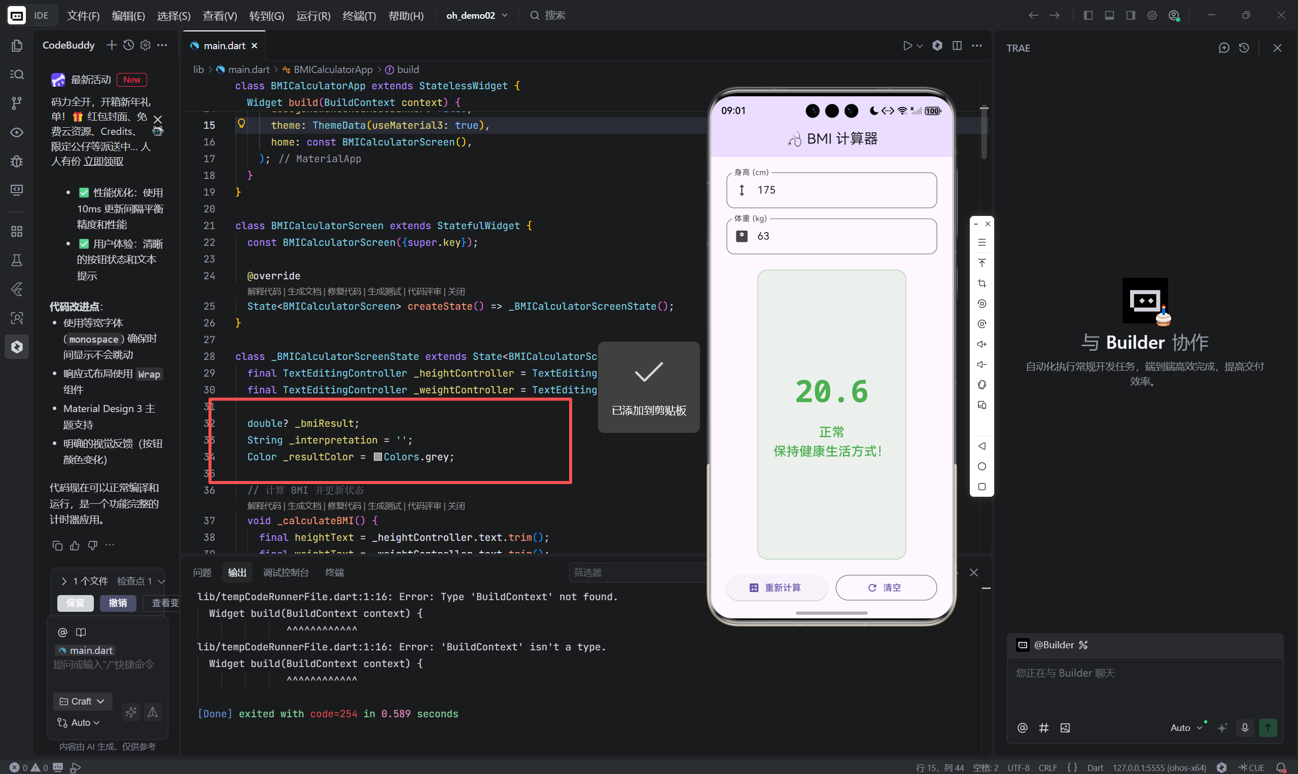 在健康类移动应用中,身体质量指数(BMI)计算器 是最常见也最具代表性的功能之一。它不仅涉及数值计算,更需要将抽象数据转化为直观、有指导意义的健康反馈。今天,我们将深入剖析一个用 Flutter 实现的 智能 BMI 计算器 ,重点探讨其如何通过 实时输入响应、健壮的数据验证、语义化色彩反馈和动态 UI 设计,打造专业且用户友好的体验。