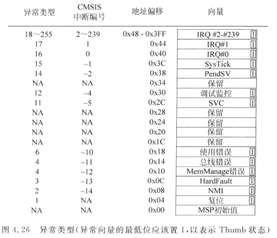 - 第1项 : 复位异常处理函数 的地址。处理器上电后执行的第一条指令就从这里取得。