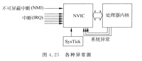 NVIC 是 Cortex-M 内核内部一个极其重要的集成模块,它负责管理所有的可配置优先级异常(即异常号4-6,11-15,以及所有外部中断IRQ)。